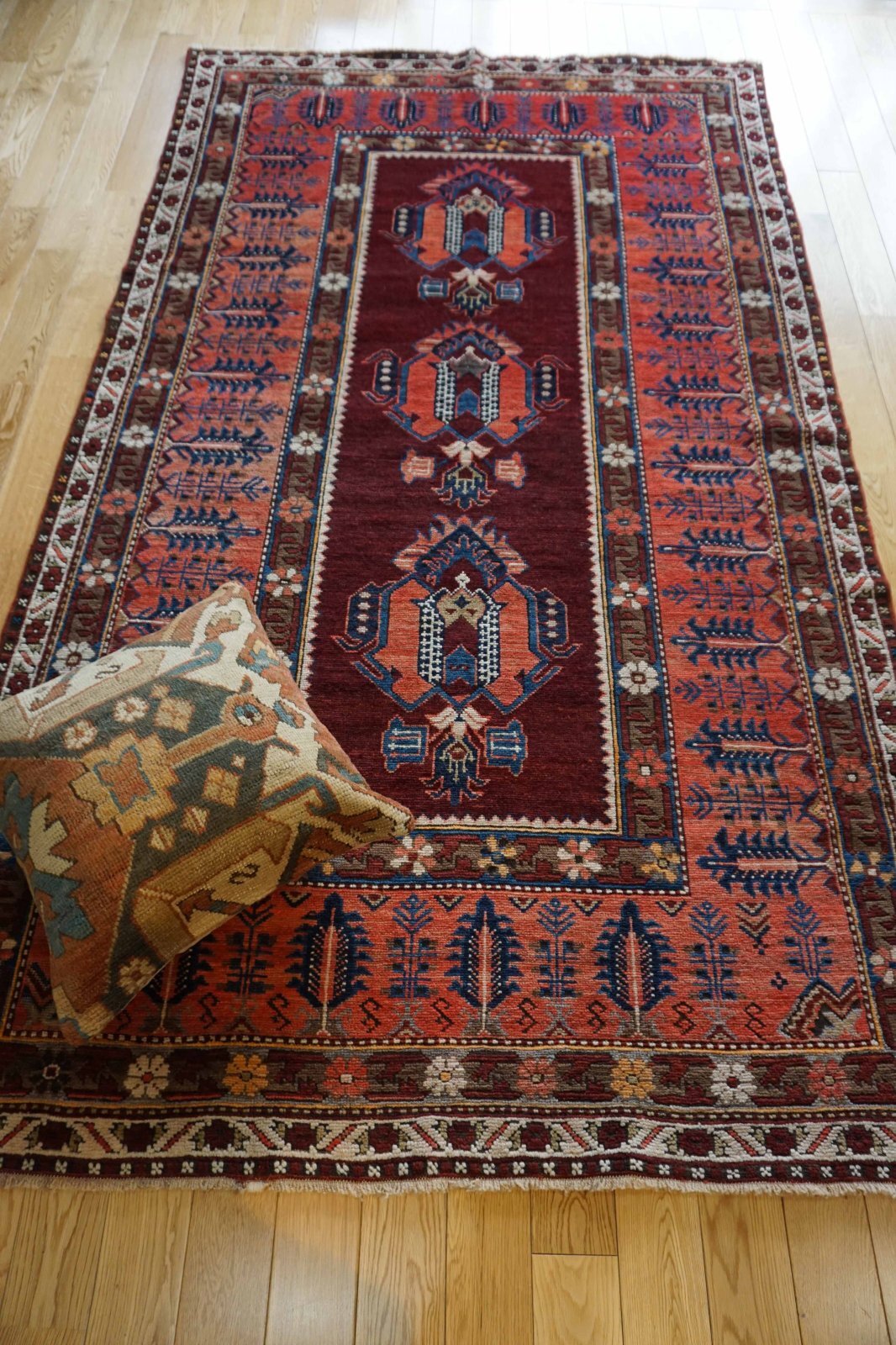 コーカサス絨毯は力強い模様が多いですが、こちらは珍しく優しい雰囲気。落ち着いた色合いに癒されます。お部屋にも合わせやすいです。