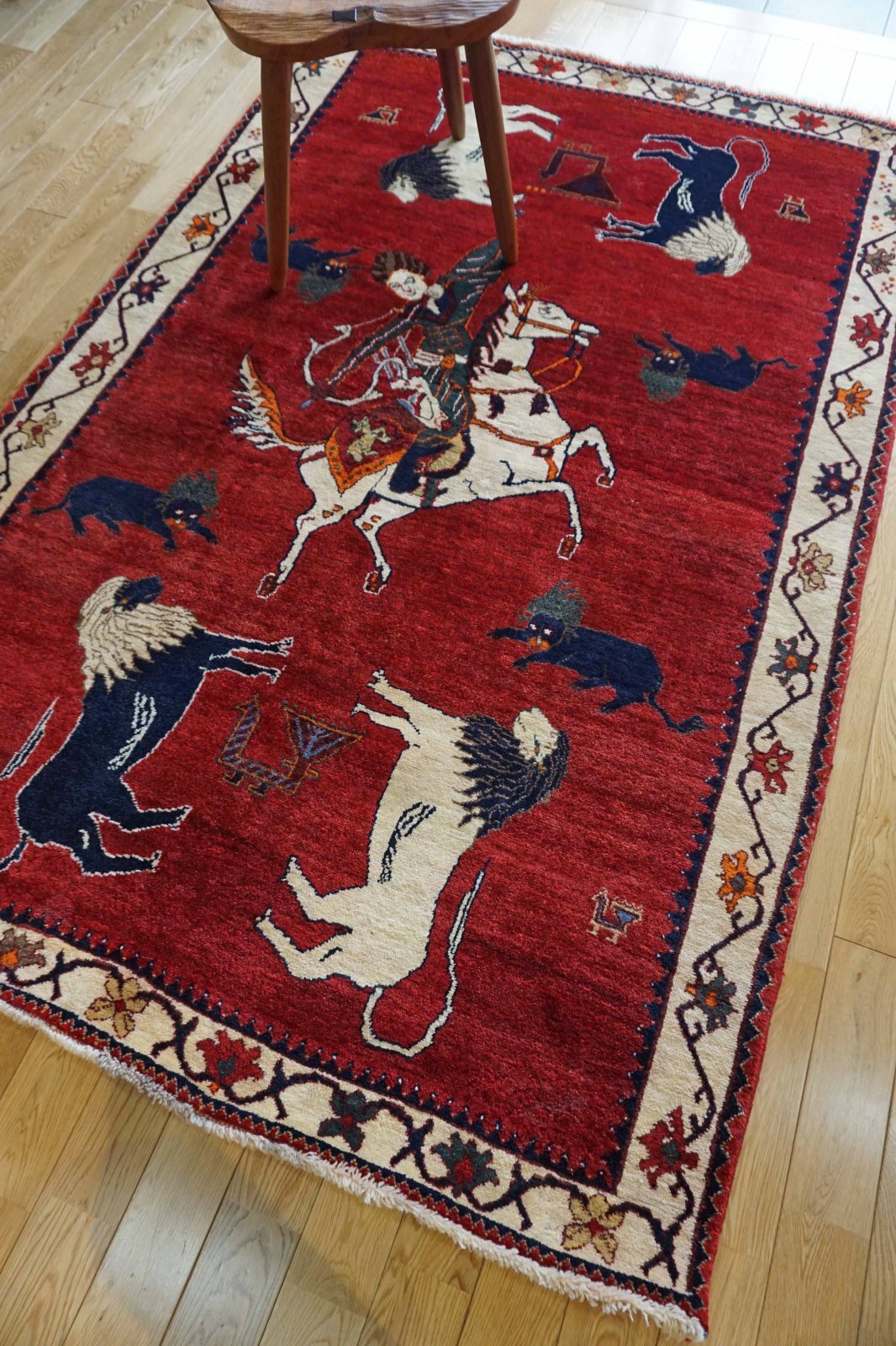最近ご購入されたベアチェアに合うギャッベをお探しに。四つの季節をあらわす模様のルリバフギャッベを選ばれました。