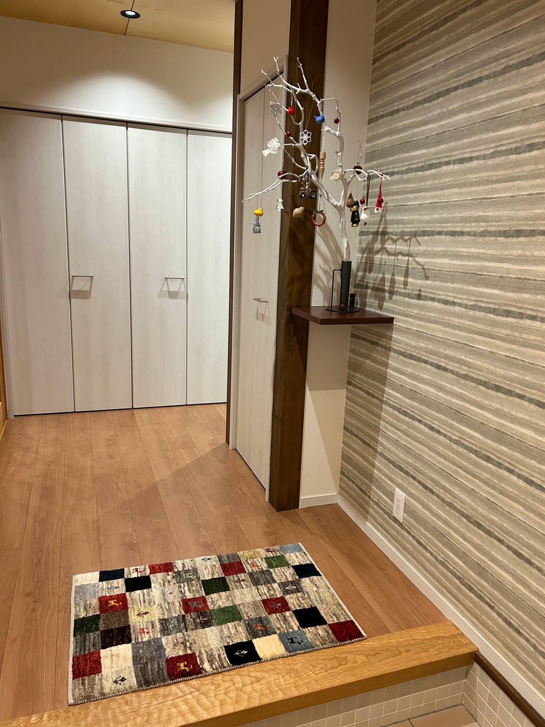 玄関マットもクロスの模様に合うか心配されてましたが、こちらもバッチリ!絨毯があると温かみがでますね。これからも楽しんでお使いください。