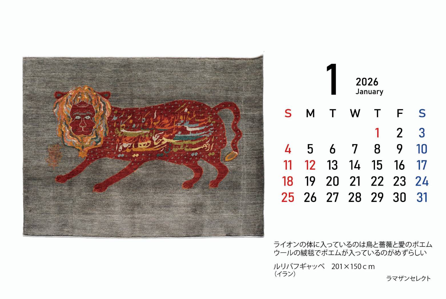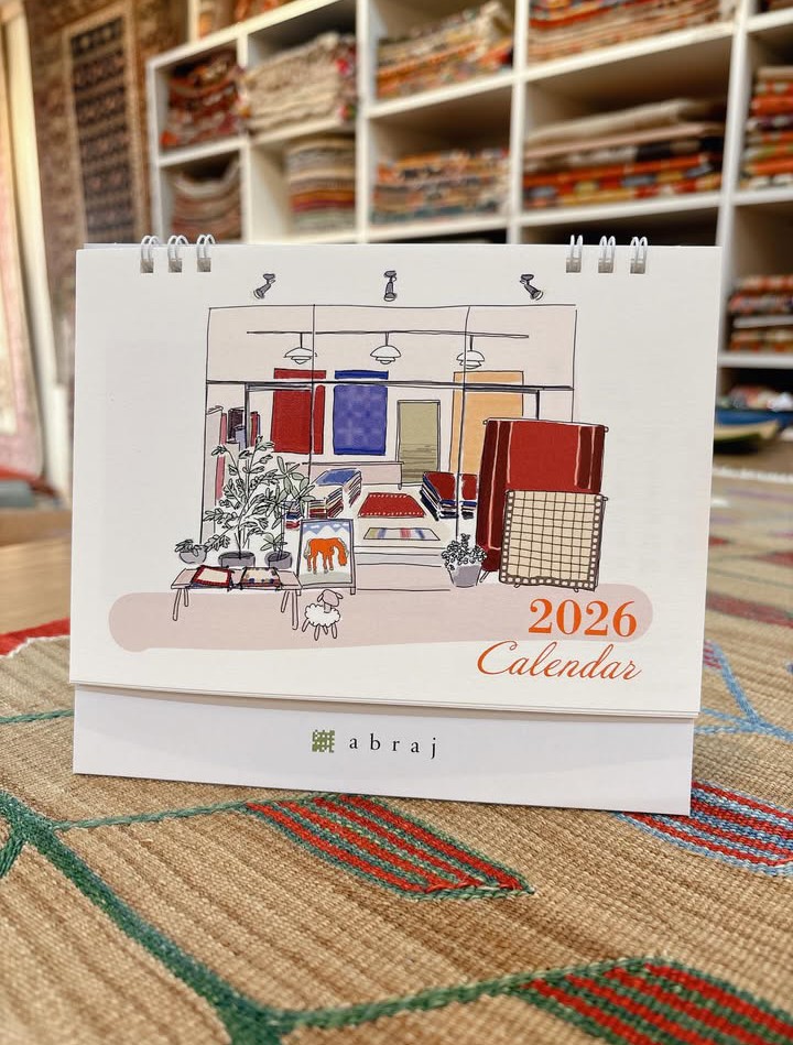 店舗の年始は1/3(土)11:00 openで福袋販売します。オンラインショップや店舗でお買い物していただいたお客様にはabrajオリジナルカレンダプレゼント!スタッフそれぞれ2枚ずつ絨毯を選び作製しました。
