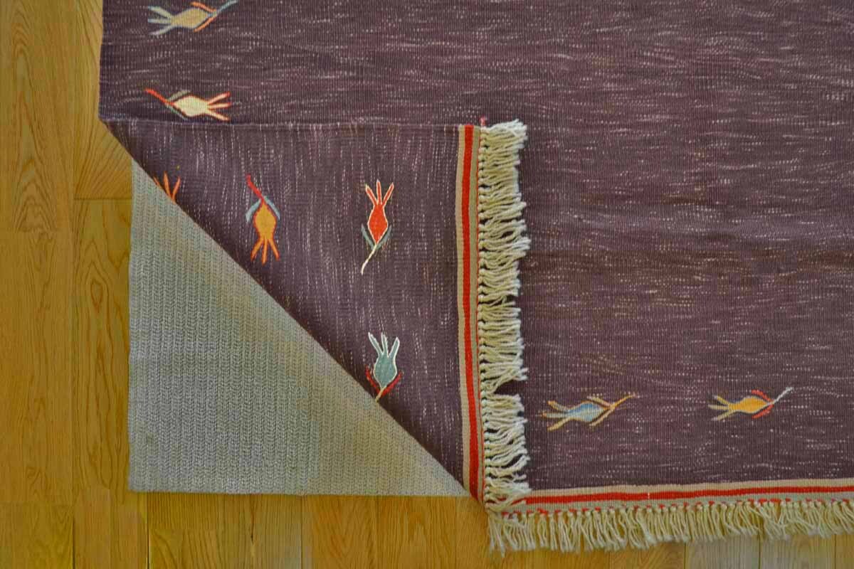 送料無料商品 キリムはトルコ・イランなどの中近東の遊牧民の生活から生まれた実用的な手織りの織物です。たくさんの模様には家族の健康や幸せ、織り手である女性の願いや思いが込められています。草木染で染めており色合いが良いのが特徴です。使えば使うほど良い風合いのキリムになっていきます。小さく折りたためるので収納する時、場所を取りません。 大き目の玄関やベッドサイドにも使えるサイズです。タペストリーとしてもお使いいただけます。[原産地]トルコ・コンヤ[素材]ウール[サイズ]141cm×105cm(フリンジのサイズは含まれていません。)