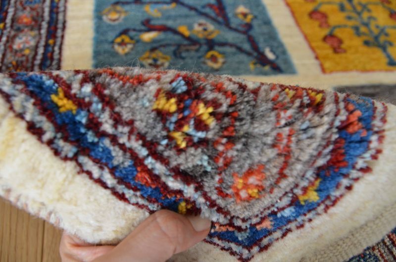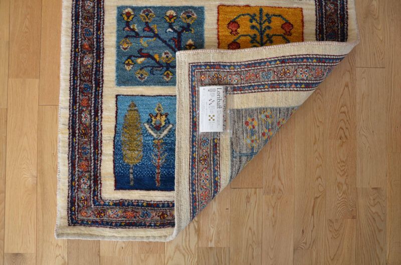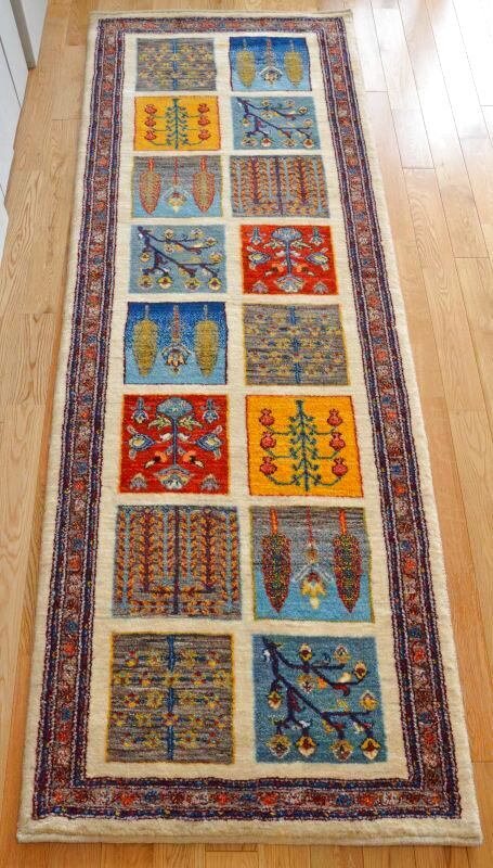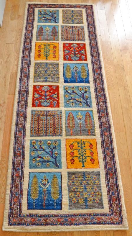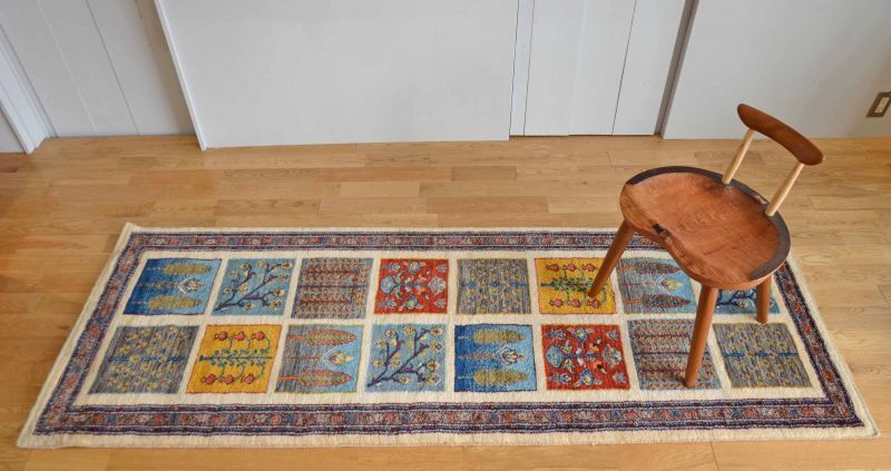 絵画を並べたような窓が並んだデザインのギャッベ。ルリバフらしい繊細な模様が綺麗です。お玄関やベッドサイド、ソファ前のアクセントにおすすめのサイズです。 ルリバフは冬を越した羊の毛を使い手紡ぎされたランクの高い糸を使っています。肌触りも柔らかく光沢があるのが特徴です。結びが細かく整った模様が魅力です。毛足は短め。 [原産地]イラン[素材]ウール[サイズ]233cm×83cm(フリンジのサイズは含まれていません。)毛の向きで色が変わります。メイン画像の左から2番目、3番目の画像(模様が逆向きになっている分)を参考にして下さい。2つの色が楽しめます。*こちらの画像で分かりにくい方はお気軽にお問い合わせください。違う角度で撮影し、画像を送ります。 送料無料商品