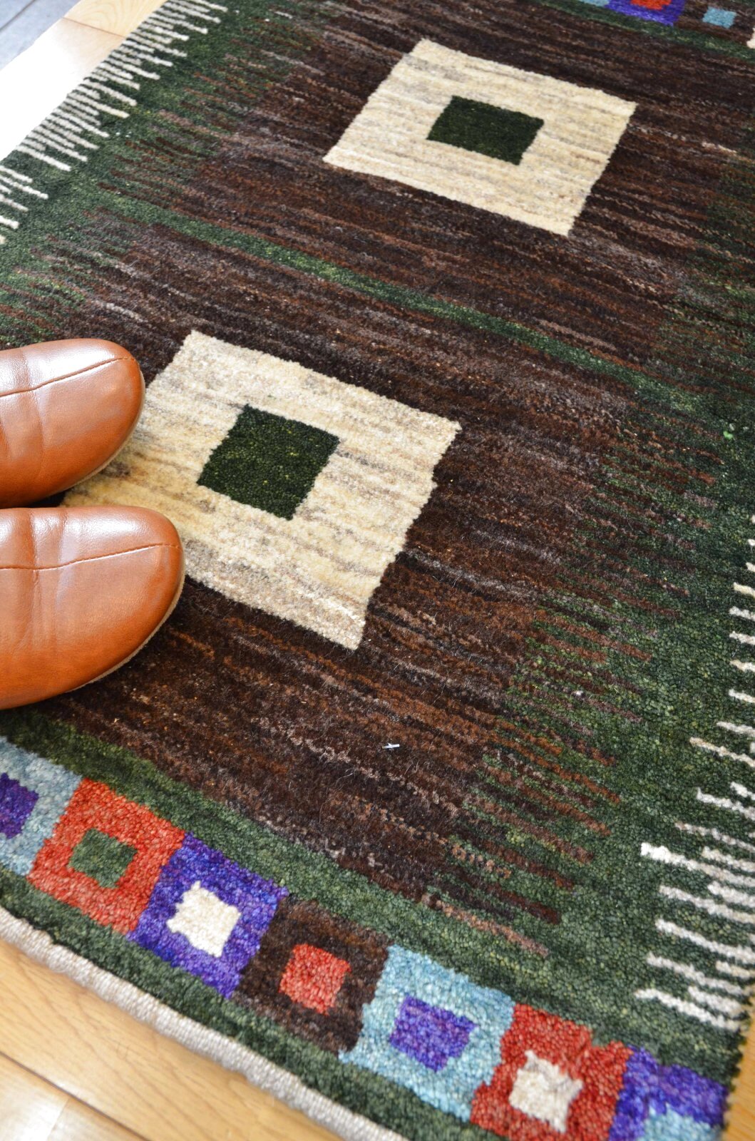 アメレは手紡ぎされたランクの高い糸を使っています。結びが細かく整った模様が魅力です。ウールの柔らかさにこだわっておりカシュクリよりも毛足が長めでフカフカしています。
