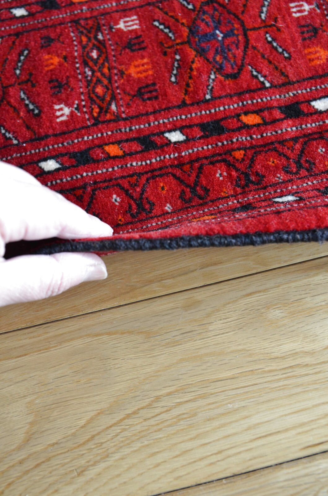赤い色とギュルと呼ばれる部族の模様が特徴。主な色は赤で、差し色に紺色や白、オレンジが使われています。比較的薄く持ち運びがしやすいです。