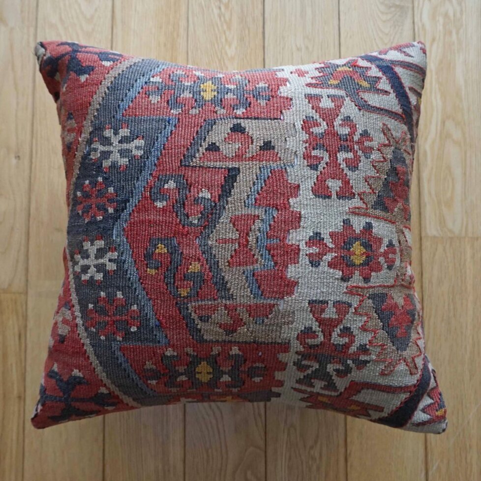 40〜100年前に手織りされたオールドキリムを使ったクッションカバー。時間と共に変化した染め色には深みがあります。昔からそこにあったかのようにお部屋に馴染んでくれます。
