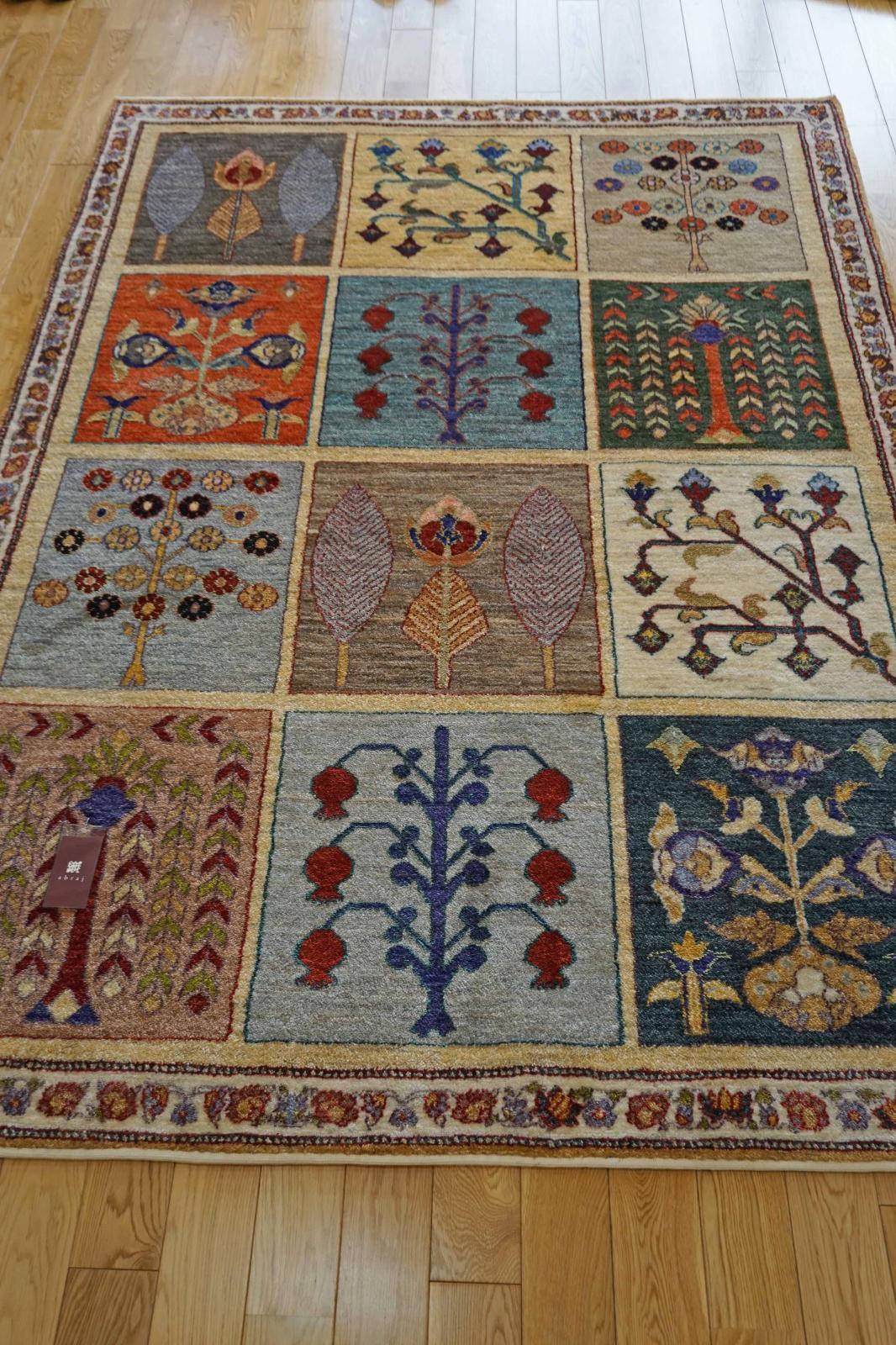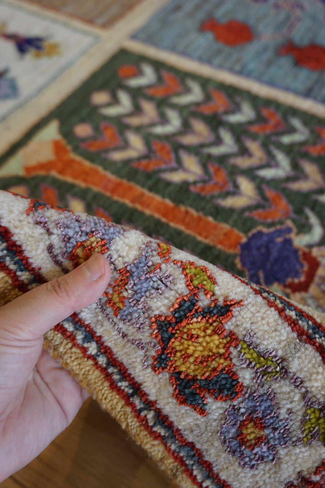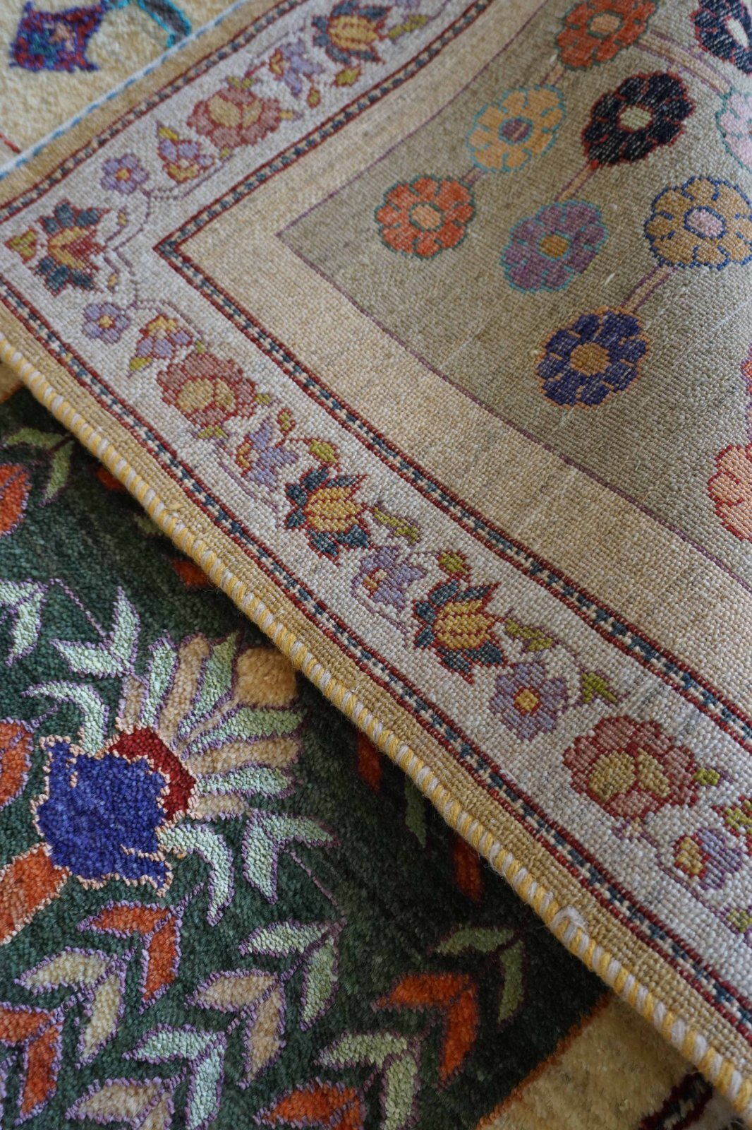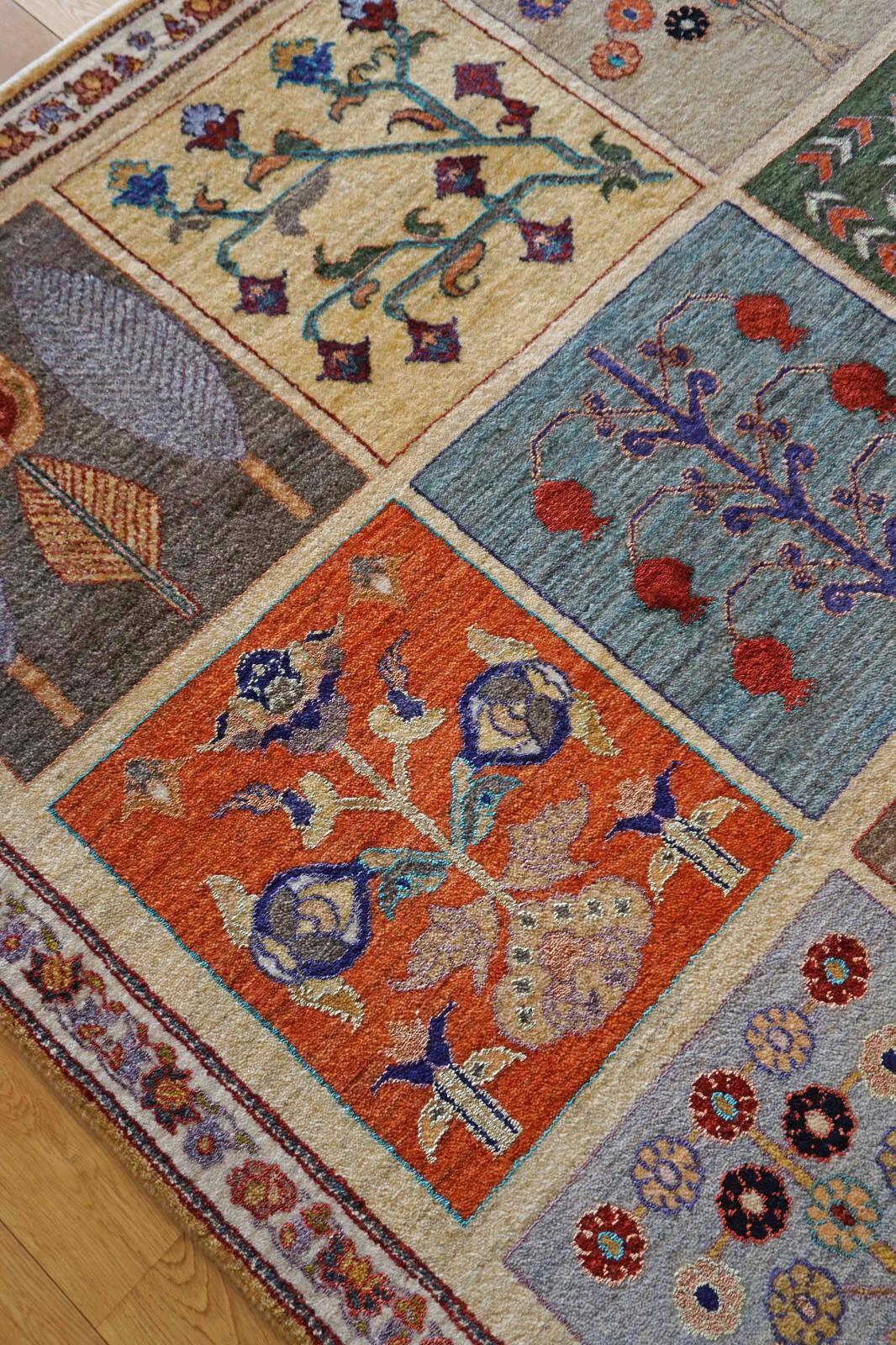 ルリバフは冬を越した羊の毛を使い手紡ぎされたランクの高い糸を使っています。肌触りも柔らかく光沢があるのが特徴です。結びが細かく整った模様が魅力です。毛足は短めでスッキリした印象。絵画のような細かい柄が特徴です。
