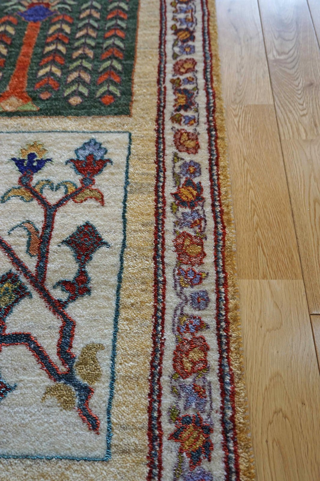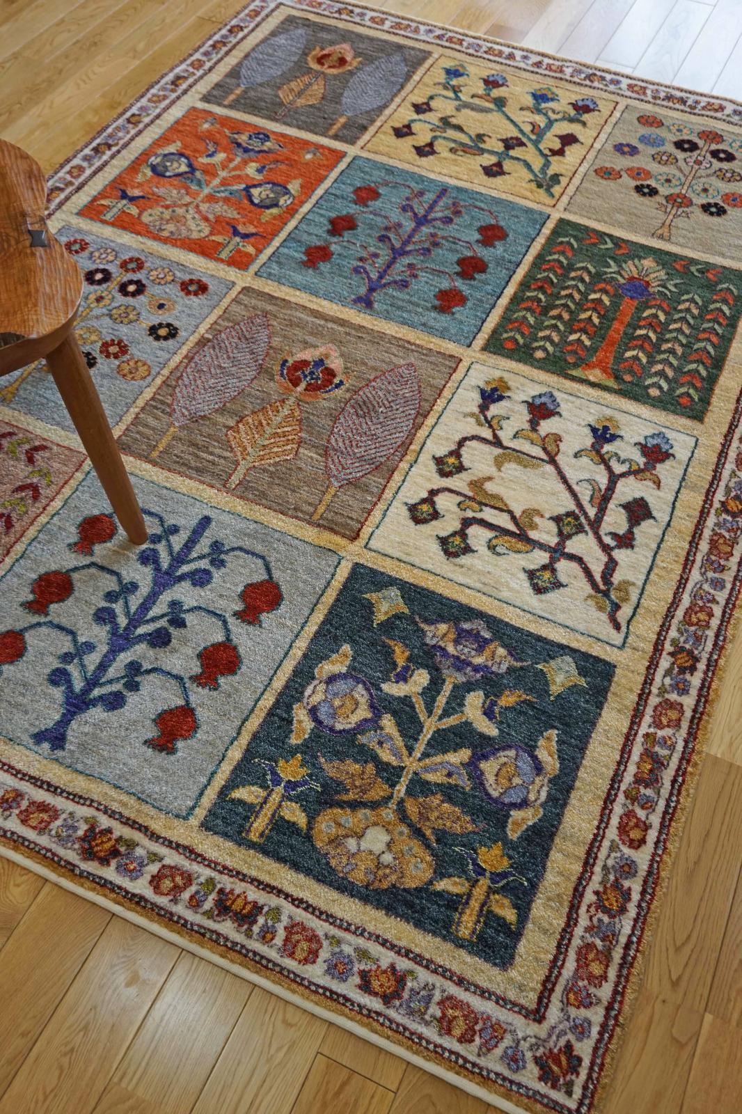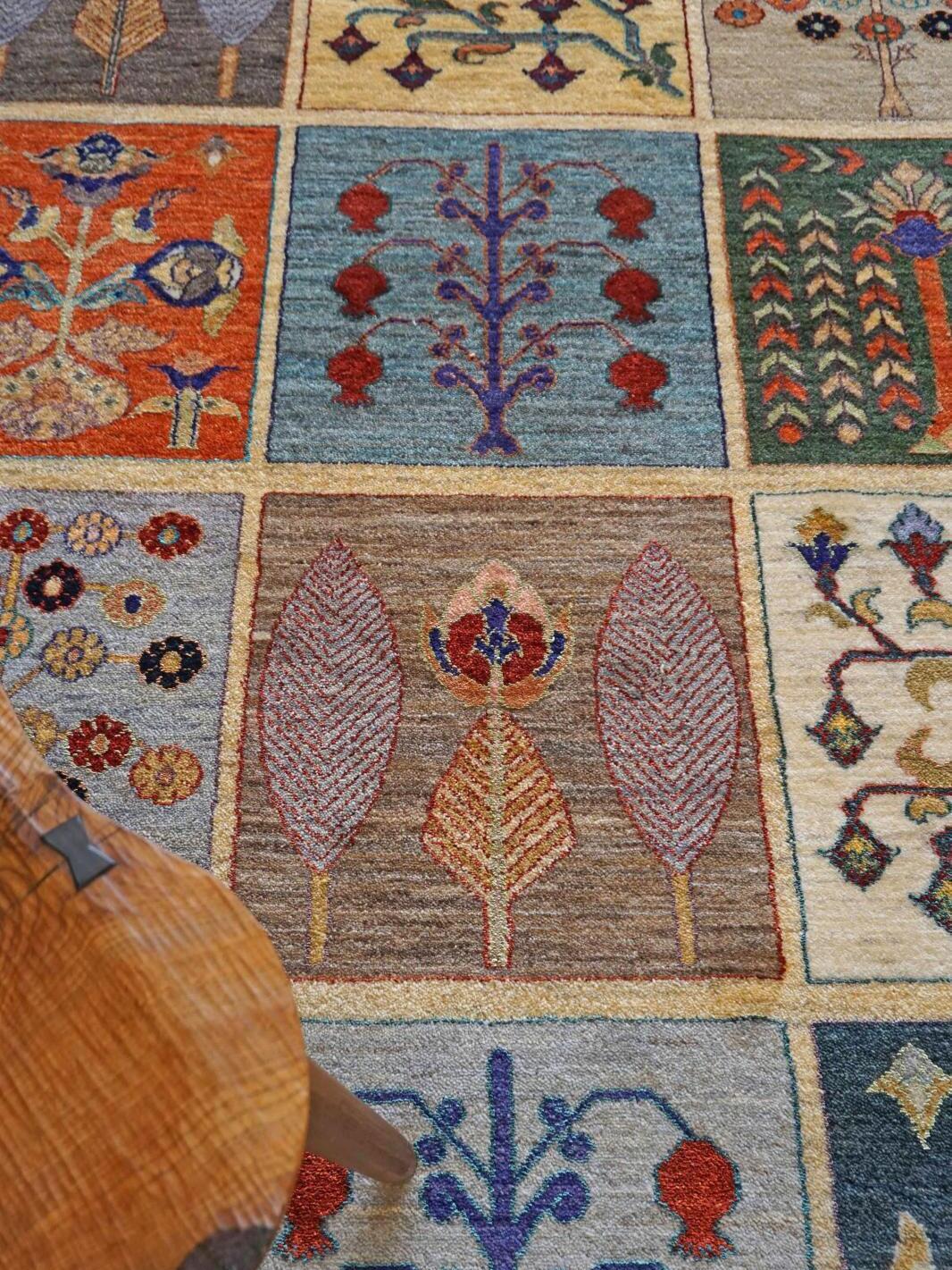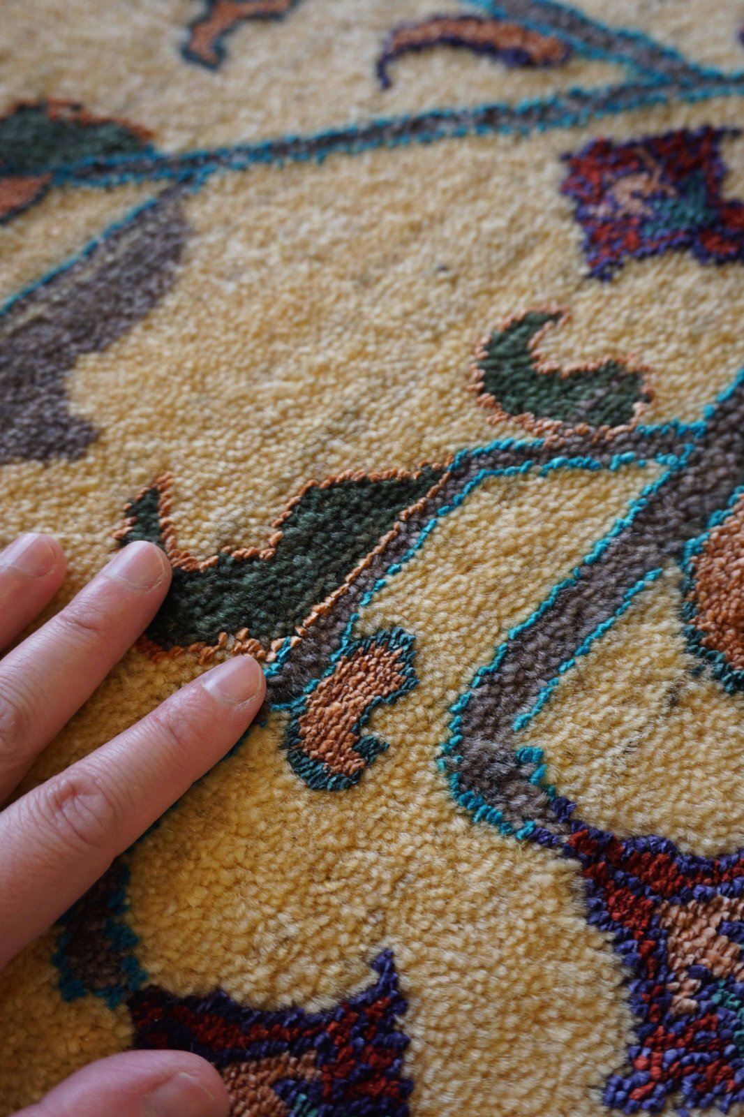 ルリバフは冬を越した羊の毛を使い手紡ぎされたランクの高い糸を使っています。肌触りも柔らかく光沢があるのが特徴です。結びが細かく整った模様が魅力です。毛足は短めでスッキリした印象。絵画のような細かい柄が特徴です。