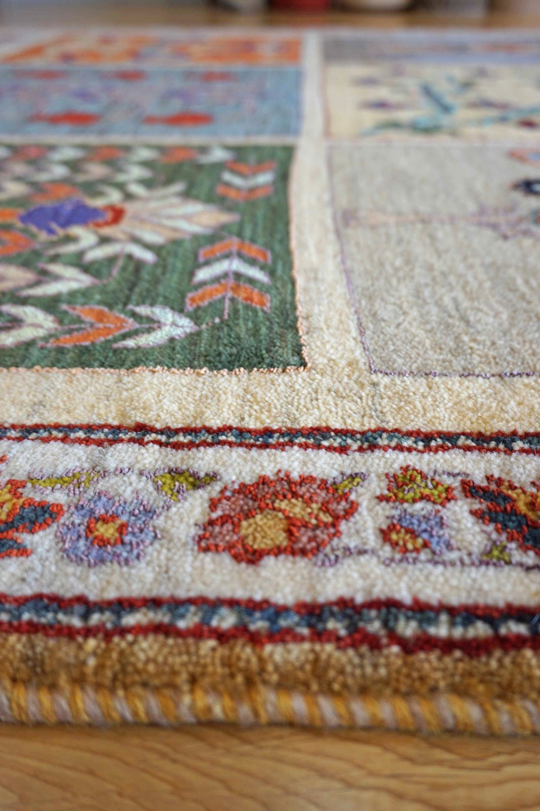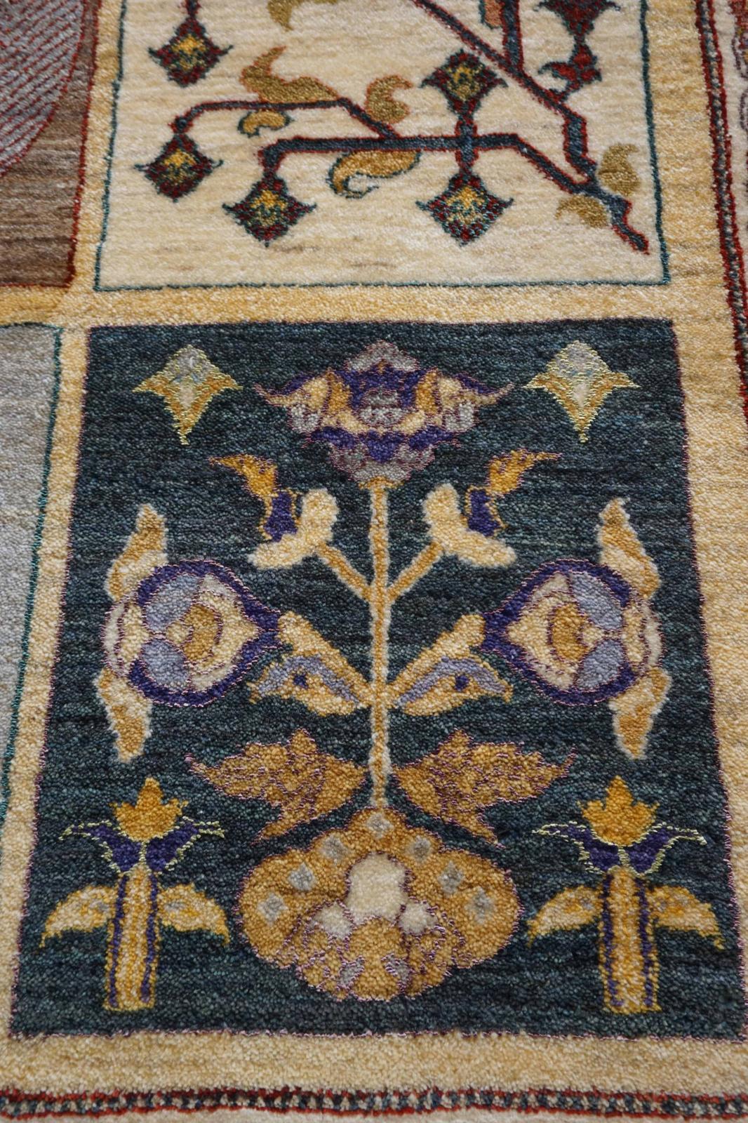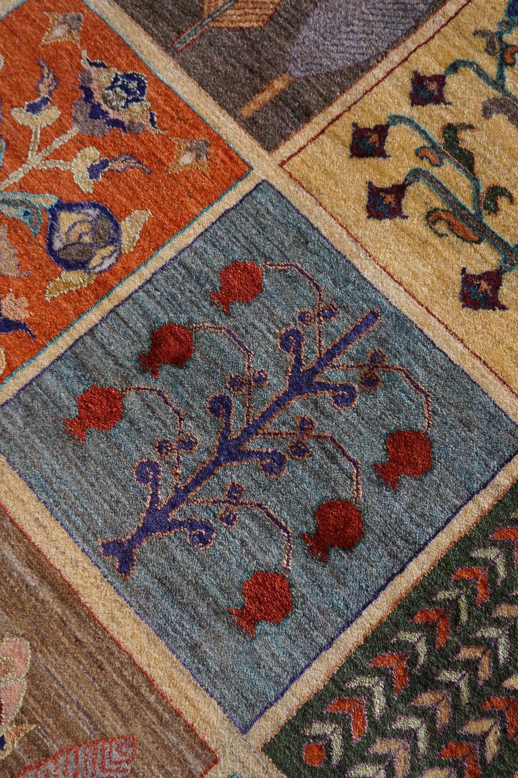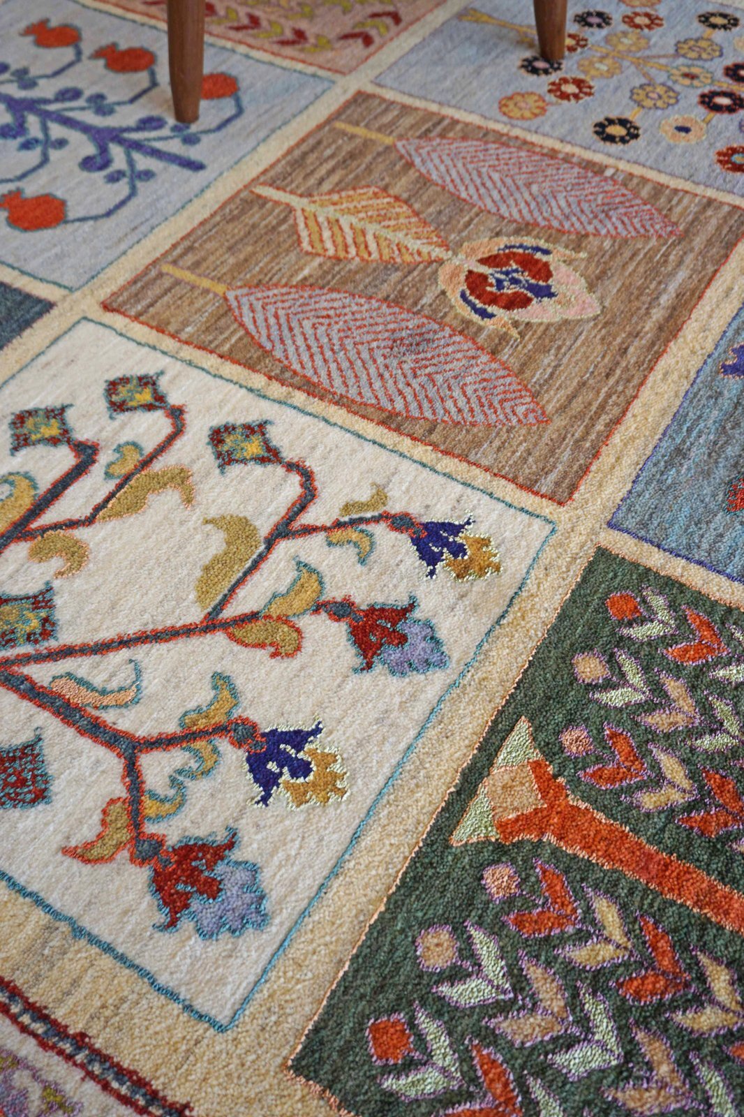 ルリバフは冬を越した羊の毛を使い手紡ぎされたランクの高い糸を使っています。肌触りも柔らかく光沢があるのが特徴です。結びが細かく整った模様が魅力です。毛足は短めでスッキリした印象。絵画のような細かい柄が特徴です。
