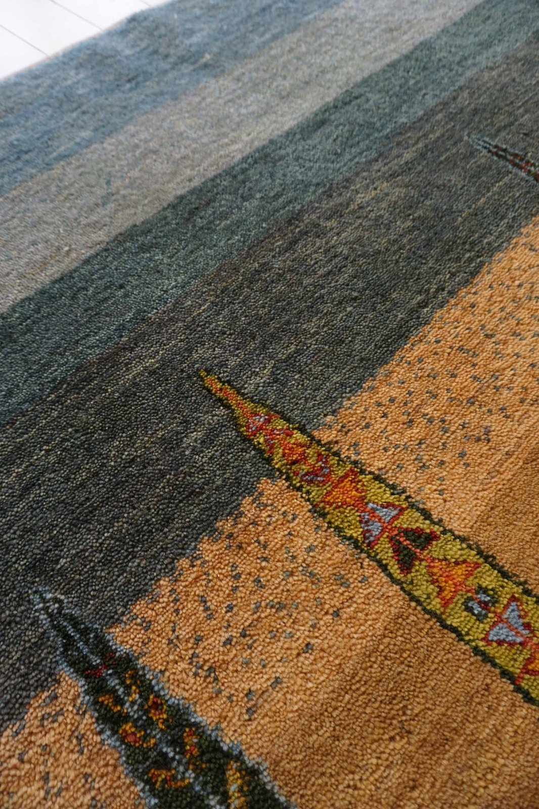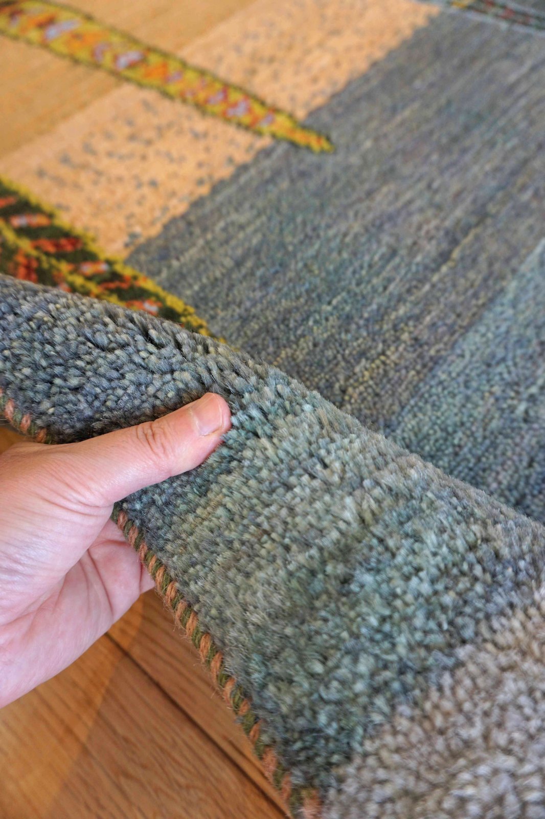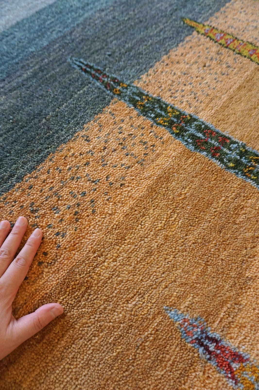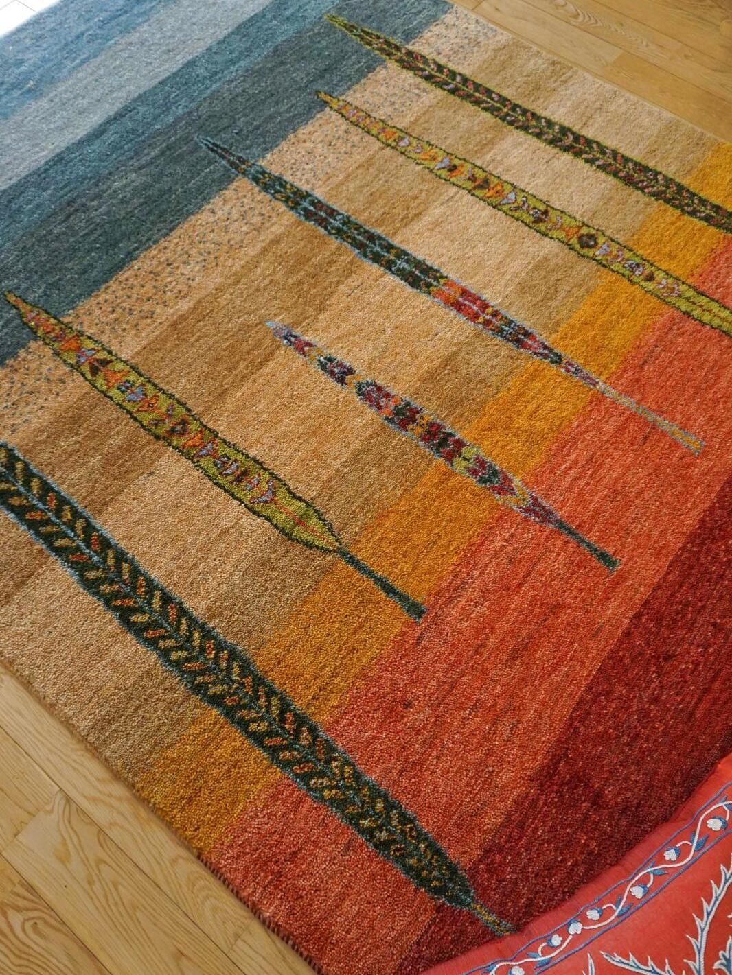カシュクリは冬を越した羊の毛を使い手紡ぎされたランクの高い糸を使っています。肌触りも柔らかく光沢があるのが特徴です。結びが細かく整った模様が魅力です。毛足は短い目でスッキリした印象。