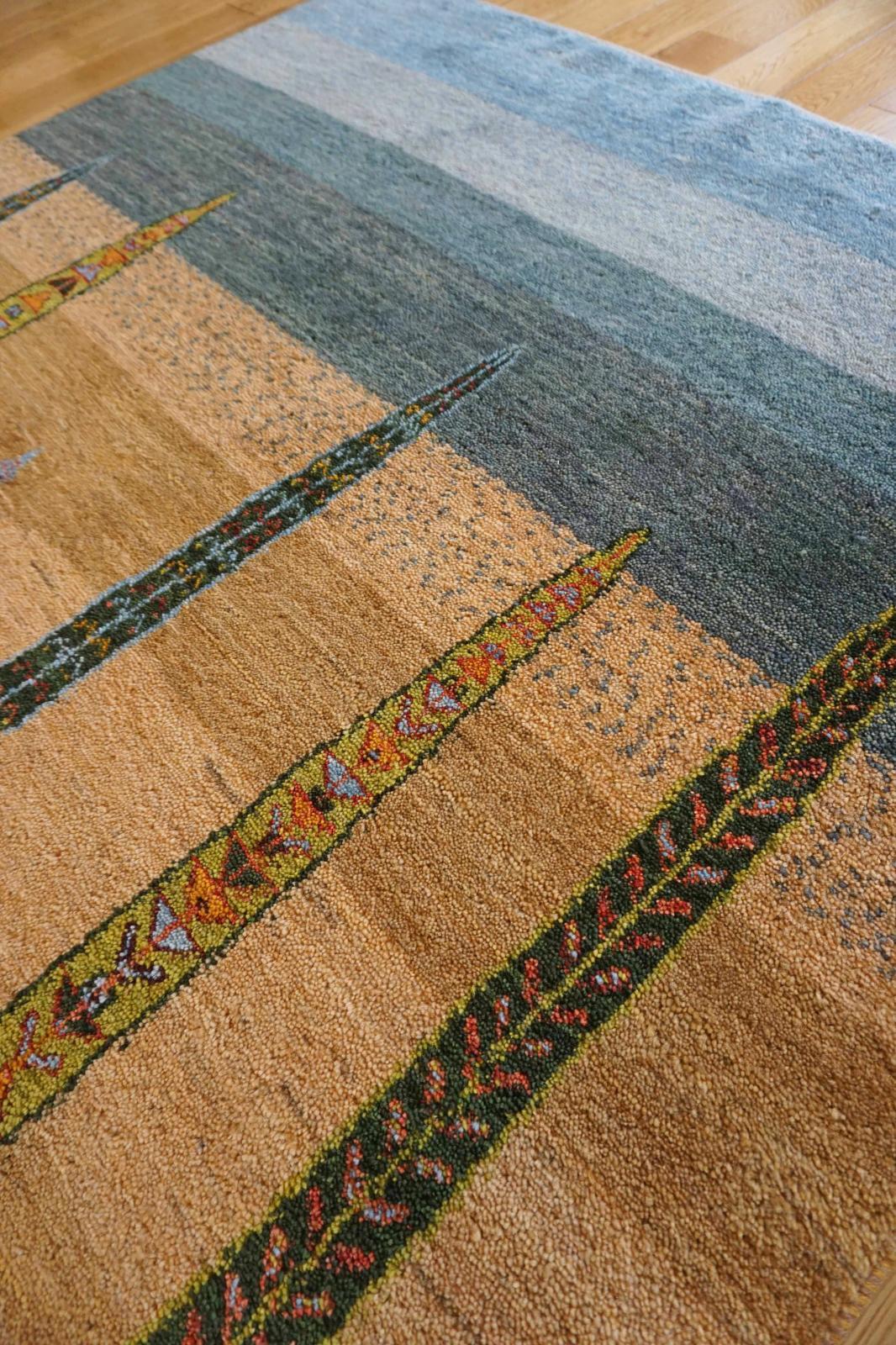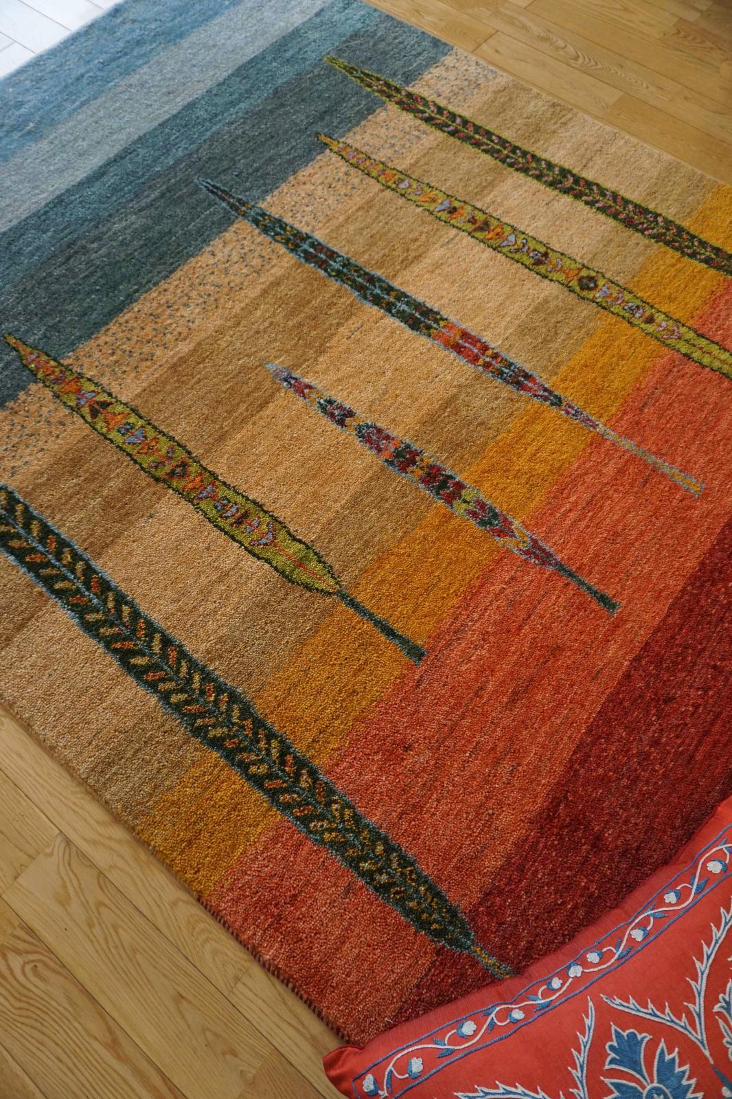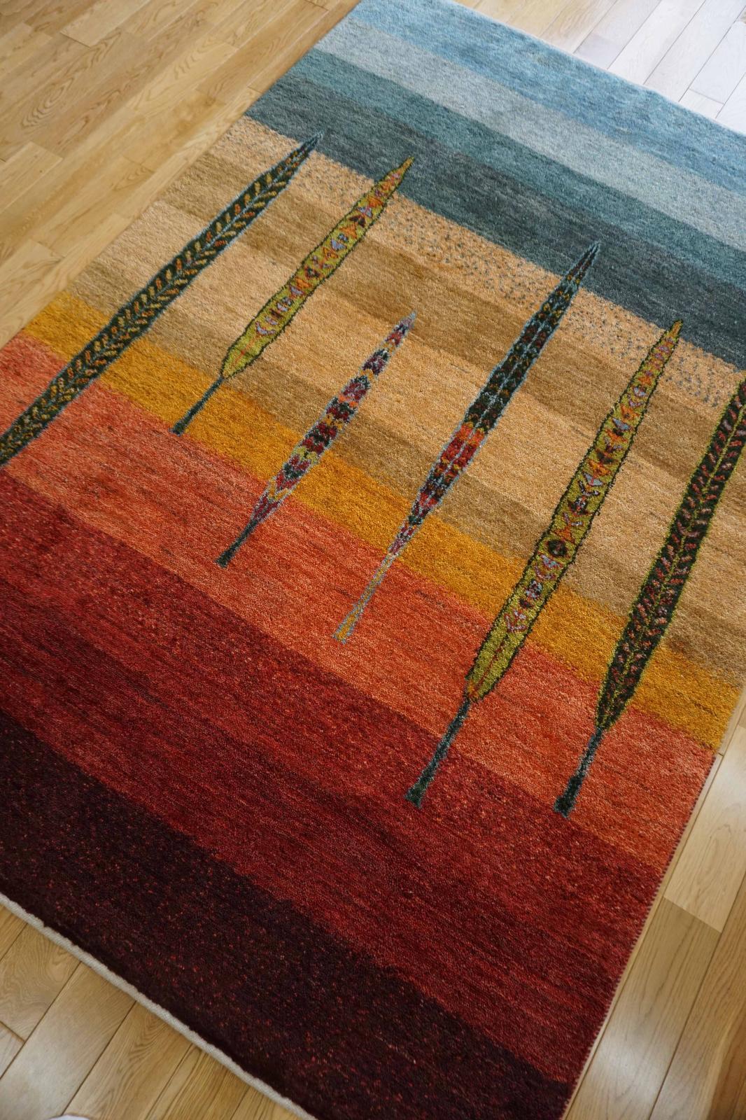 カシュクリは冬を越した羊の毛を使い手紡ぎされたランクの高い糸を使っています。肌触りも柔らかく光沢があるのが特徴です。結びが細かく整った模様が魅力です。毛足は短い目でスッキリした印象。