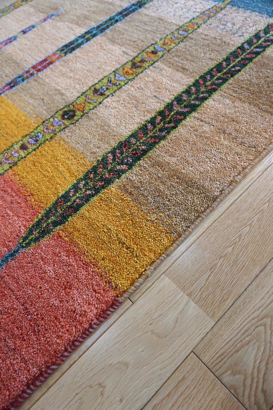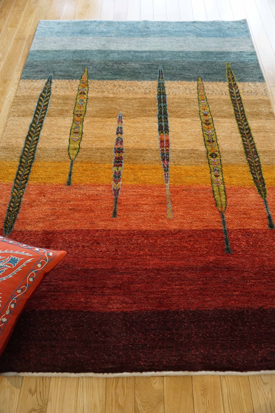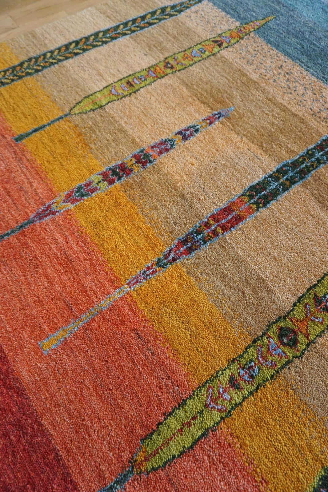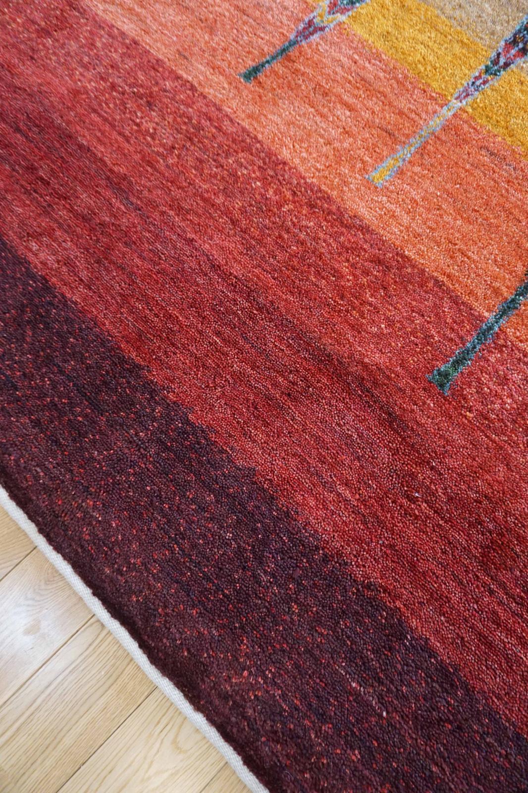 カシュクリは冬を越した羊の毛を使い手紡ぎされたランクの高い糸を使っています。肌触りも柔らかく光沢があるのが特徴です。結びが細かく整った模様が魅力です。毛足は短い目でスッキリした印象。