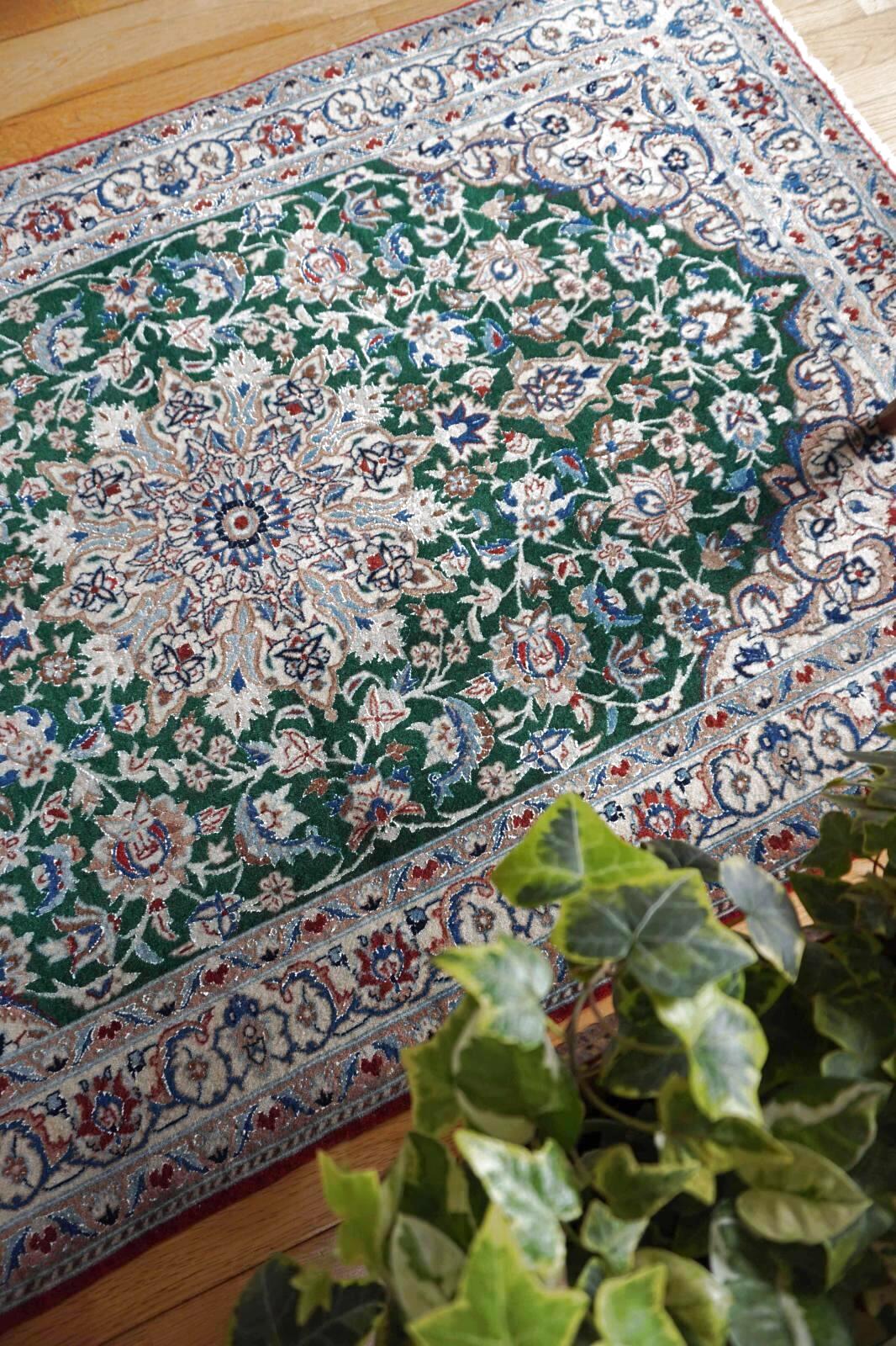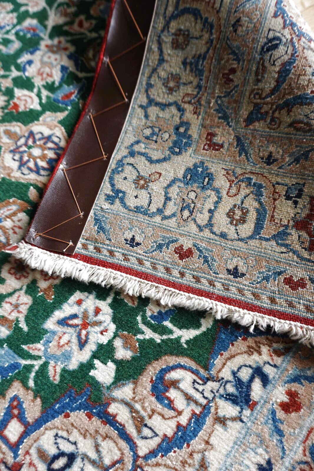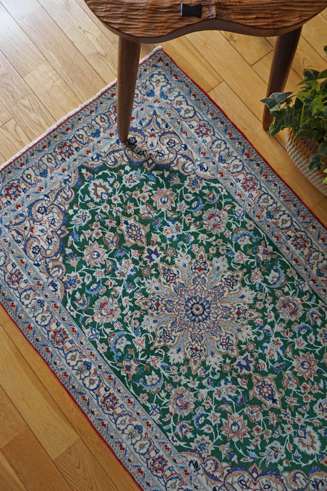 ナインはイランの中部にある町。ナイントゥデシクはナインより結びが細かく、国内用にに作られた絨毯なので数が少なく貴重です。グリーンやブルー、ベージュや白、控え目で明るい色合いが多くヨーロッパでも人気のある絨毯です。