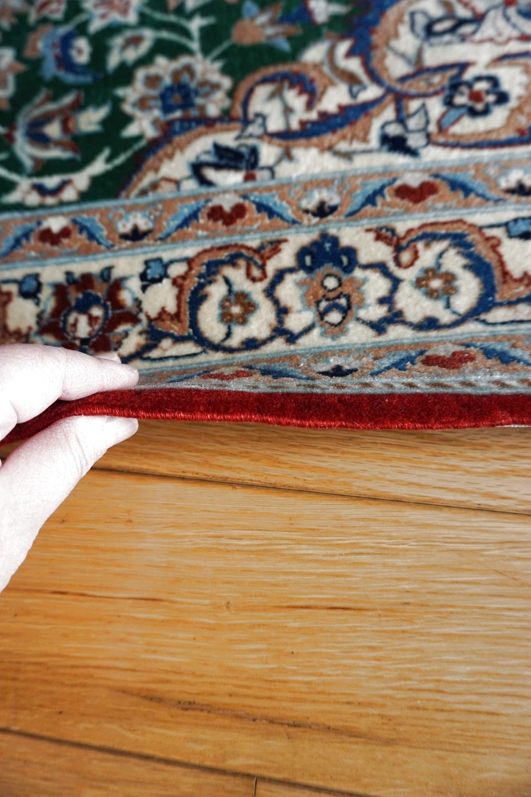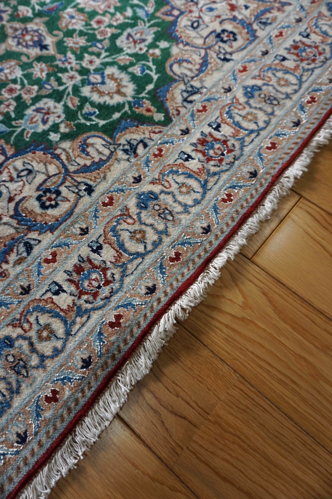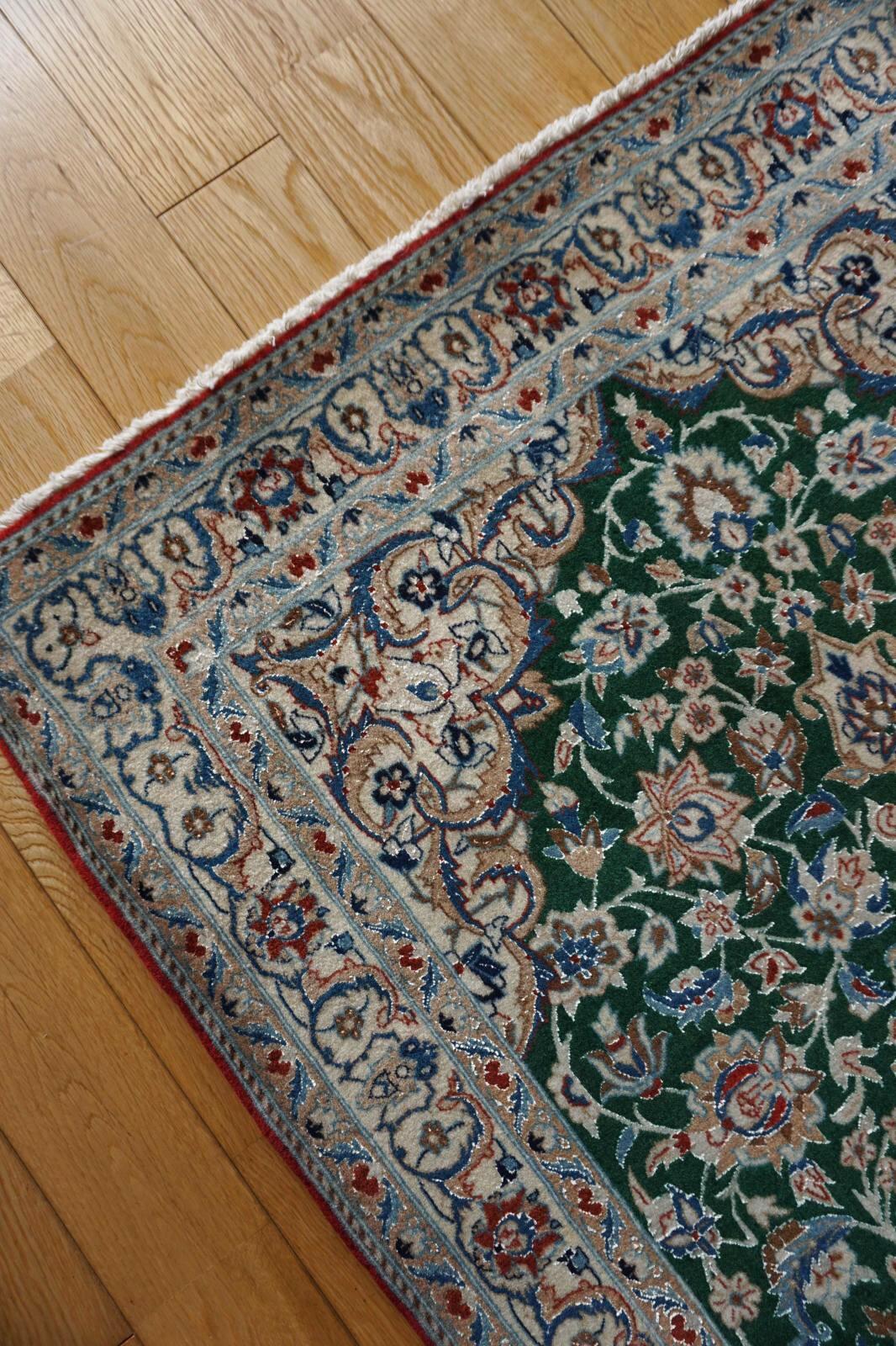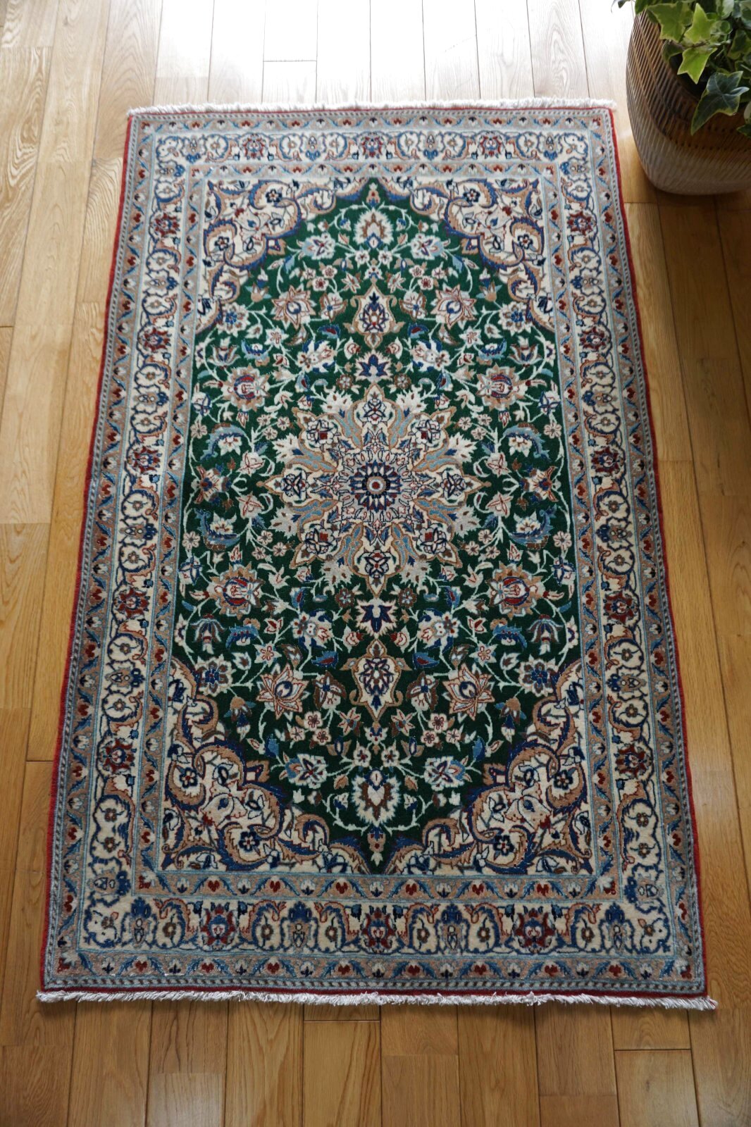 ナインはイランの中部にある町。ナイントゥデシクはナインより結びが細かく、国内用にに作られた絨毯なので数が少なく貴重です。グリーンやブルー、ベージュや白、控え目で明るい色合いが多くヨーロッパでも人気のある絨毯です。