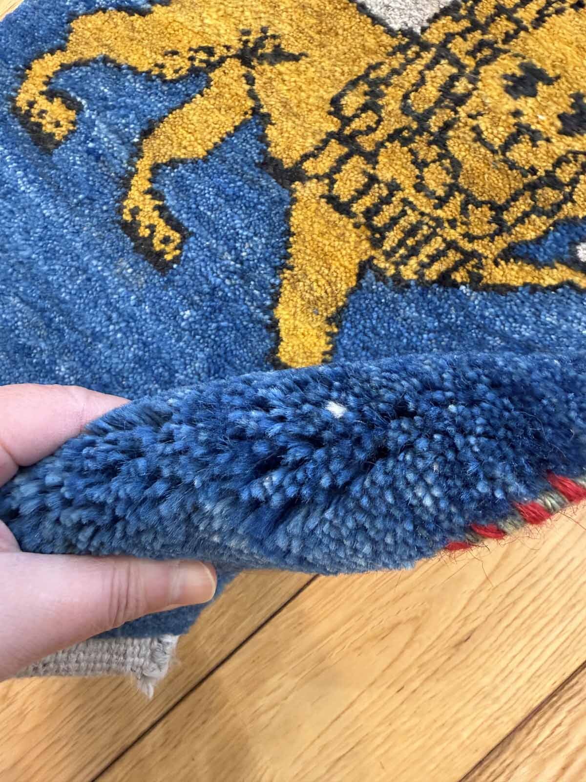 カシュクリは冬を越した羊の毛を使い手紡ぎされたランクの高い糸を使っています。肌触りも柔らかく光沢があるのが特徴です。結びが細かく整った模様が魅力です。毛足は短い目でスッキリした印象。