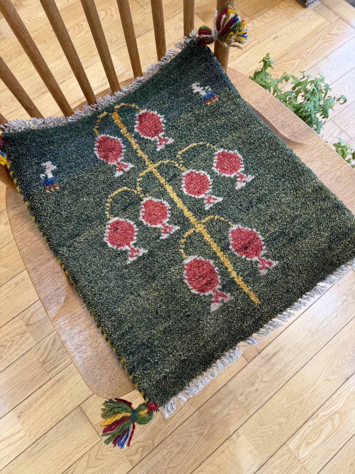 ダイニングチェアやベンチにちょうどいいギャッベ座布団サイズ。夏もサラッとして暑くなく、一年中敷いていただけます。車のシートやキャンプのチェアにもおすすめ。
