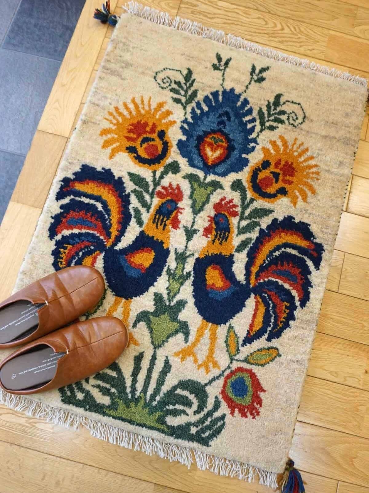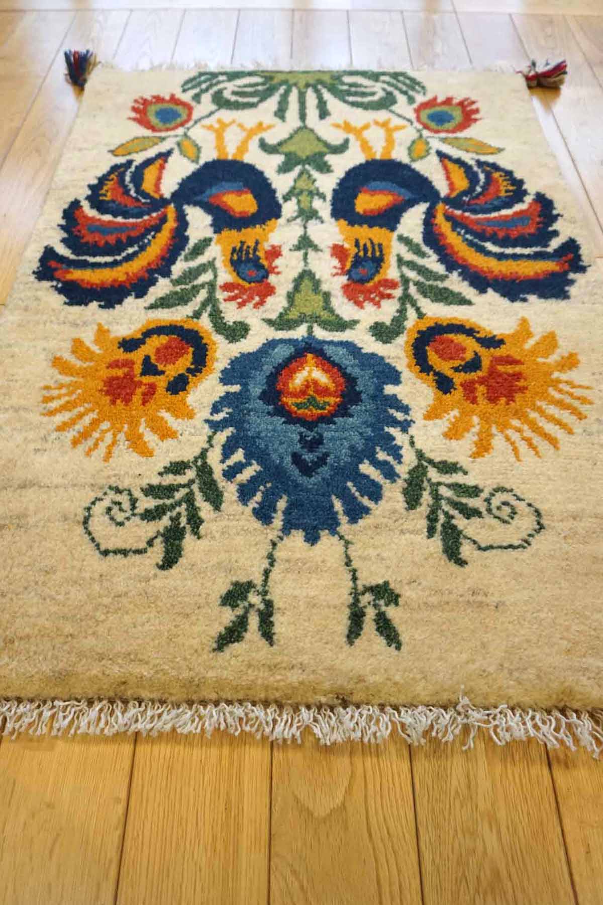 ギャッベは毛足が長くフンワリ感があります。結びが大きいので模様も大きく手作りの温かさがあります。