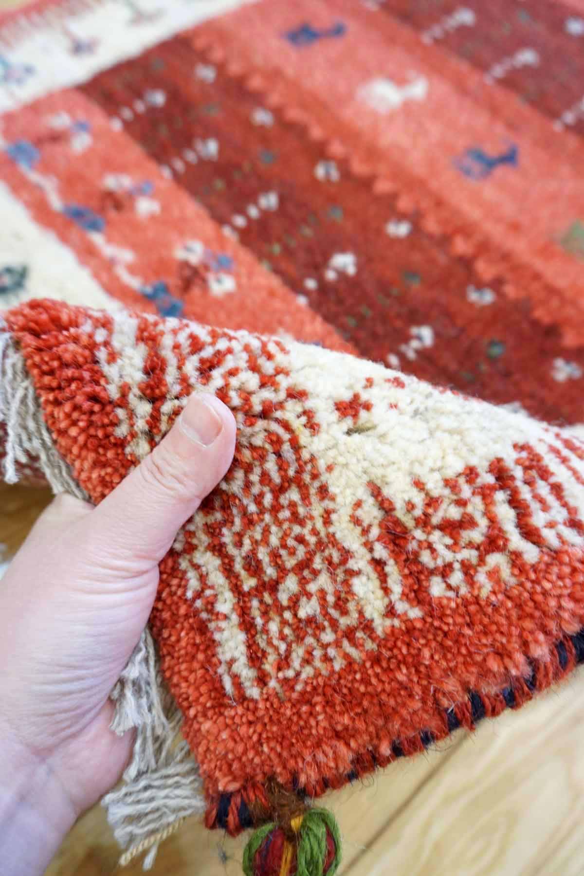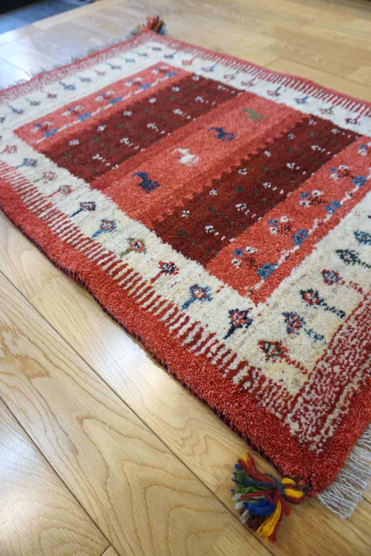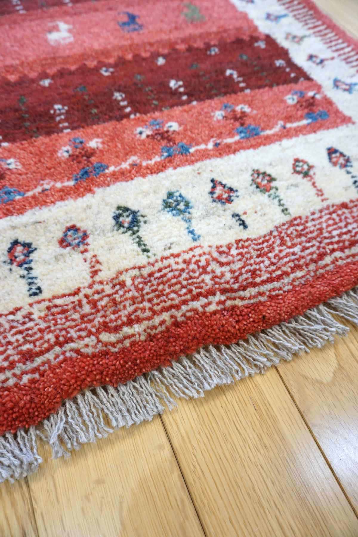 ギャッベは毛足が長くフンワリ感があります。結びが大きいので模様も大きく手作りの温かさがあります。