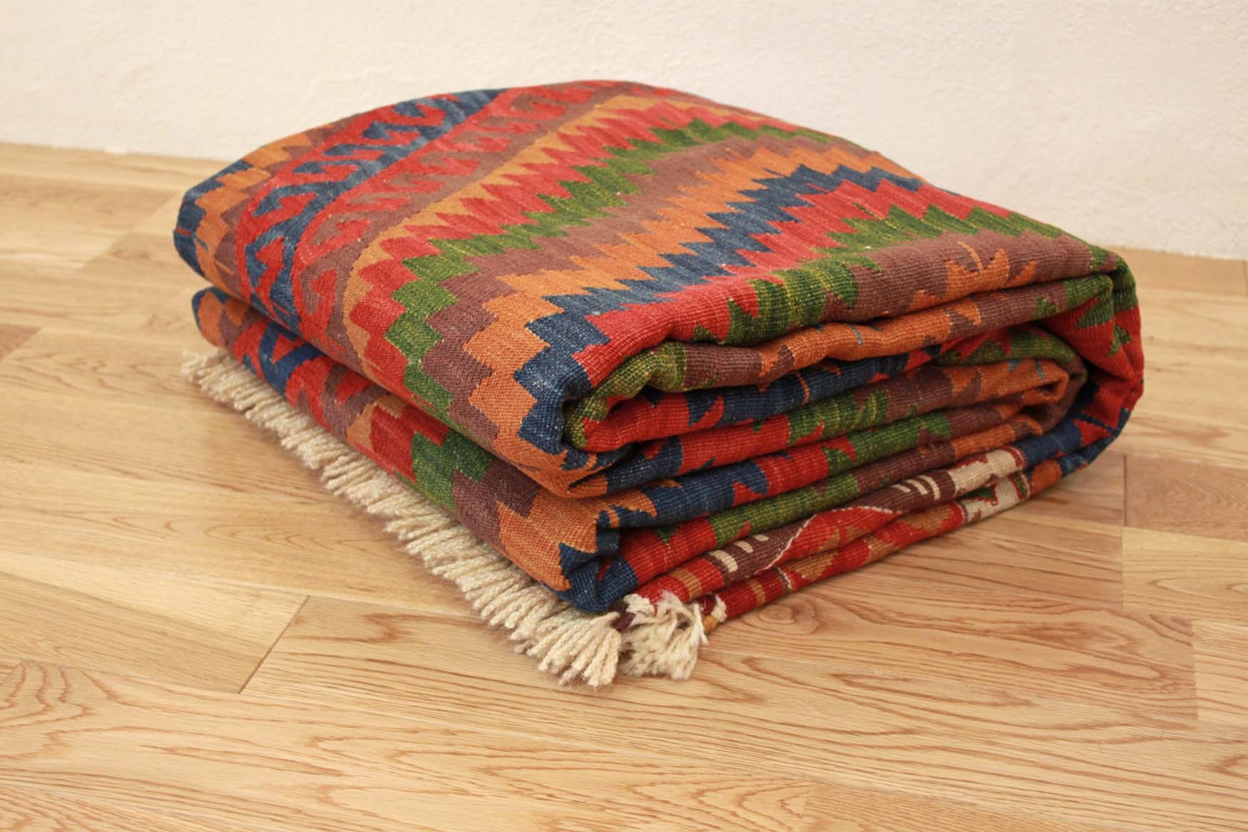 キリムはトルコ・イランなど中近東の遊牧民の生活から生まれた実用的な毛足の無い手織りの織物です。たくさんの模様には家族の健康や幸せ、織り手である女性の願いや思いが込められています。