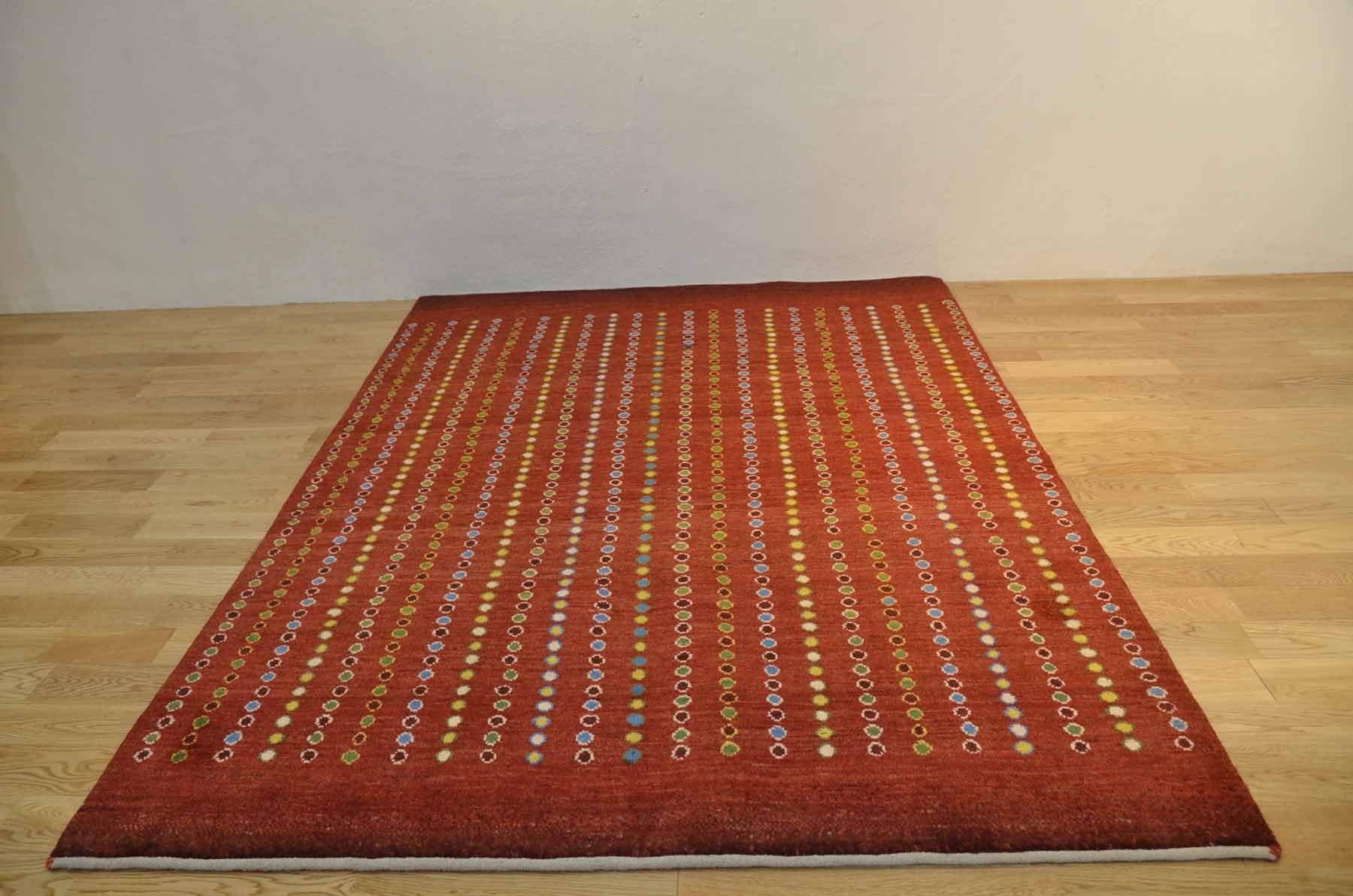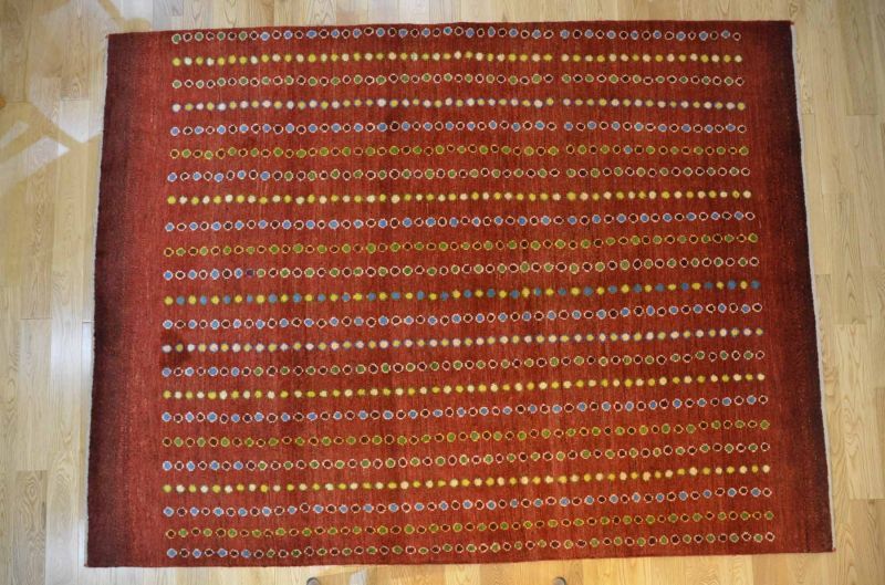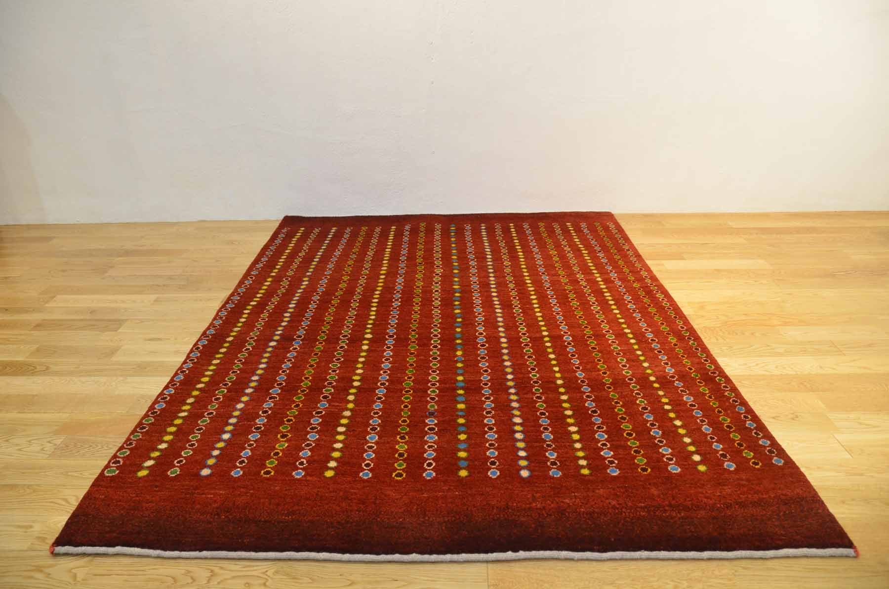 四角の中に長寿を願う生命の木の模様や幸せを呼び込む窓の模様など、たくさんの模様が入っている楽しいギャッベです。お部屋の雰囲気を変えたい時にお勧めの模様です。