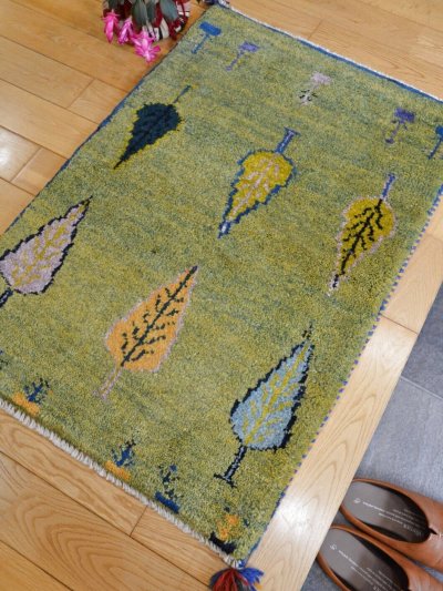 ギャッベは毛足が長くフンワリ感があります。結びが大きいので模様も大きく手作りの温かさがあります。
