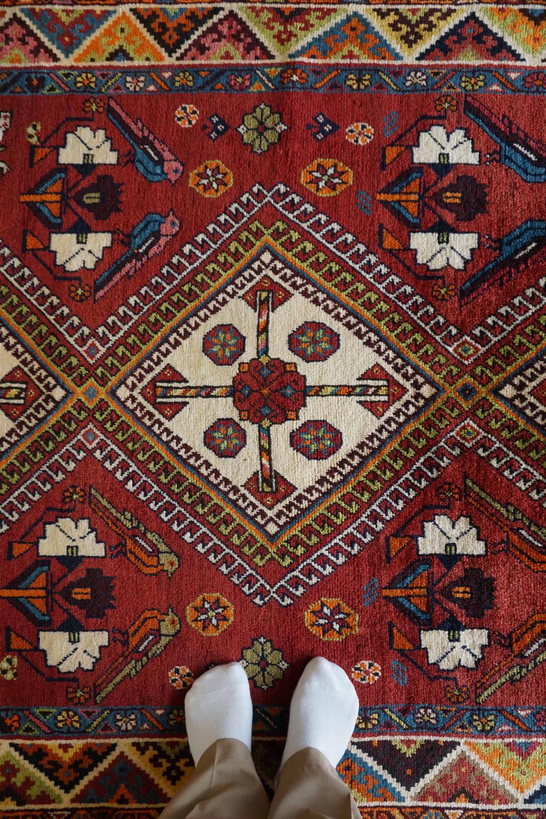 作られてから時間が経っているので新しいギャッベに比べ肌触りが柔らかいのと、時間が経つことで出る深みのある色に特徴があります。