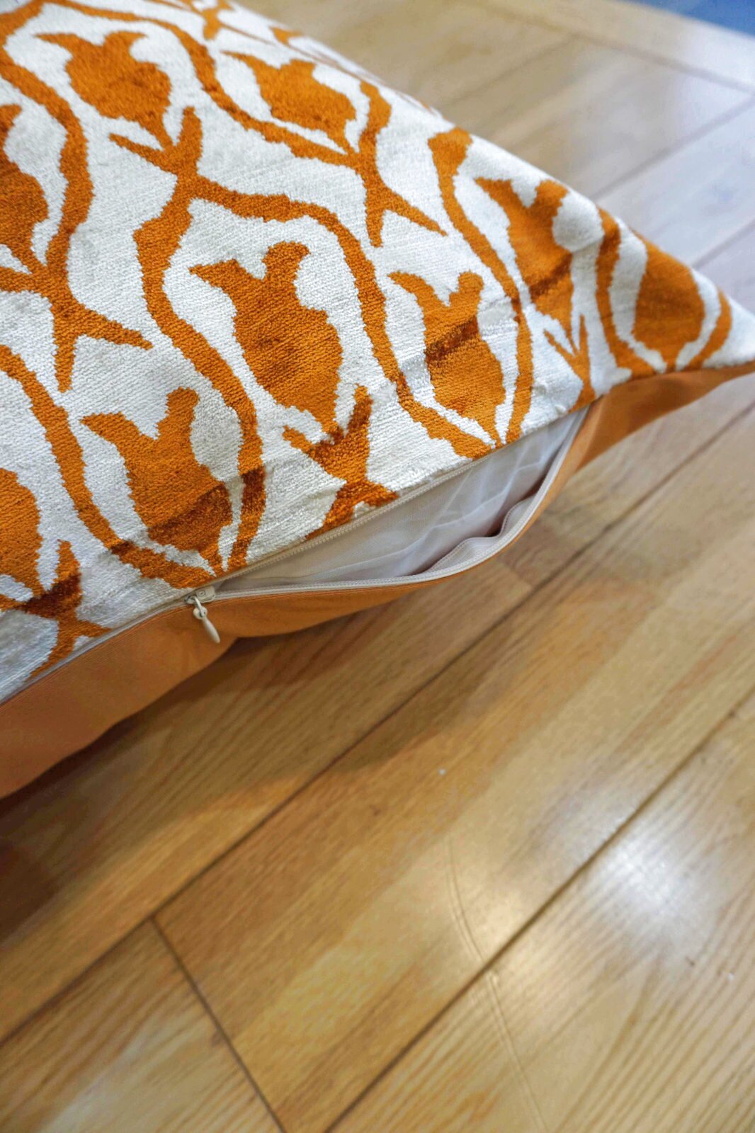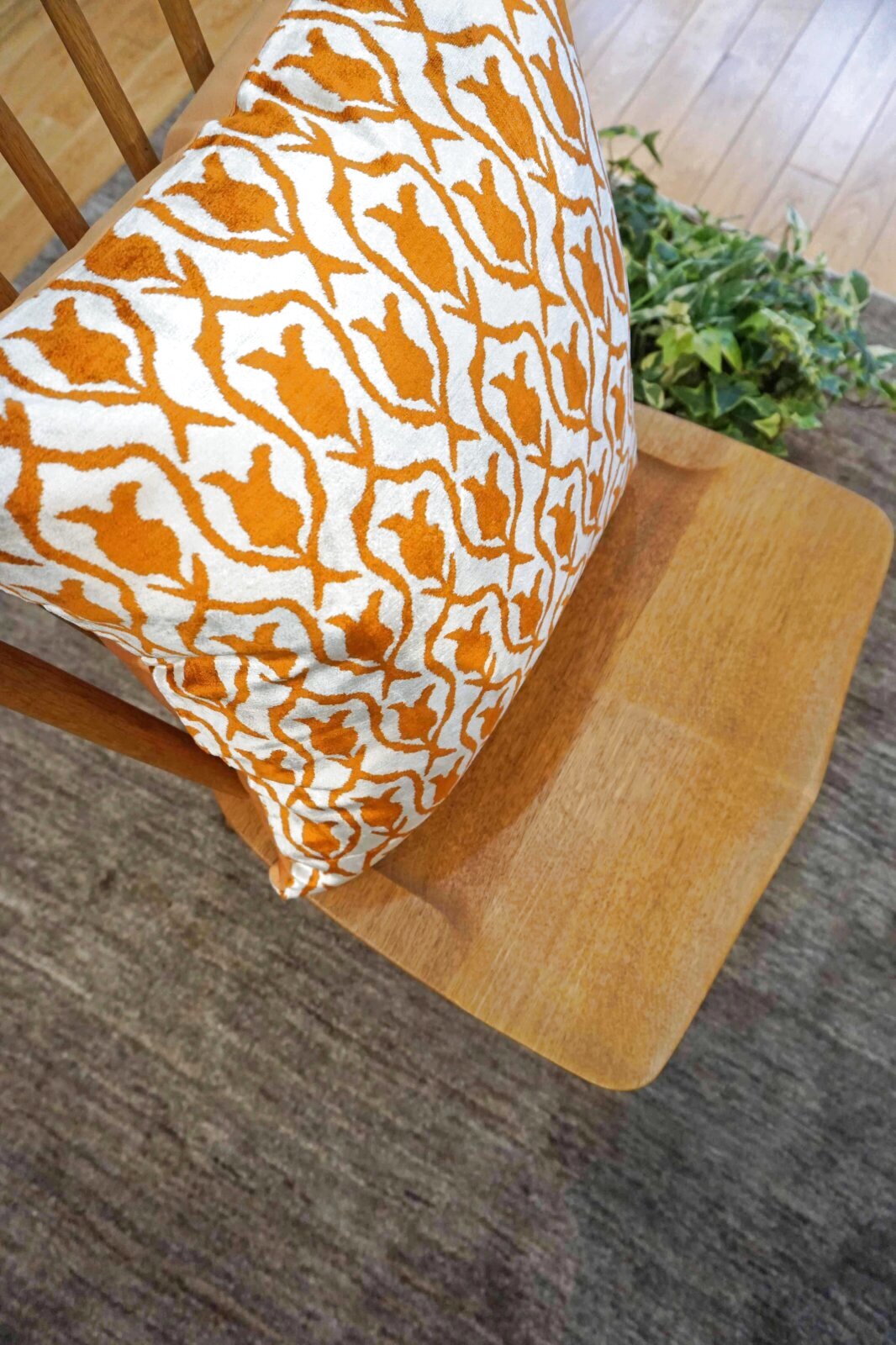 表はシルクのベルベット生地。肌触りが柔らかいので、背もたれにしていただいても気持ち良くお使いいただけます。