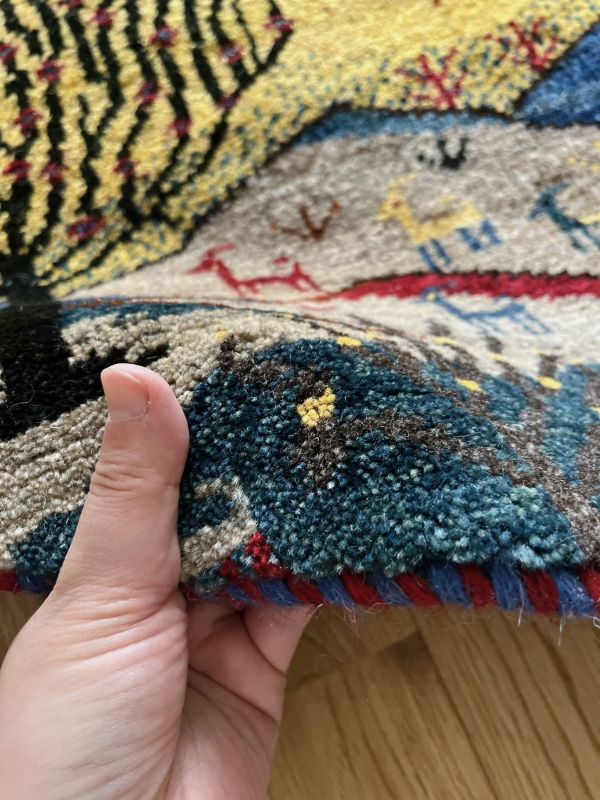 カシュクリは冬を越した羊の毛を使い手紡ぎされたランクの高い糸を使っています。肌触りも柔らかく光沢があるのが特徴です。結びが細かく整った模様が魅力です。毛足は短い目でスッキリした印象。