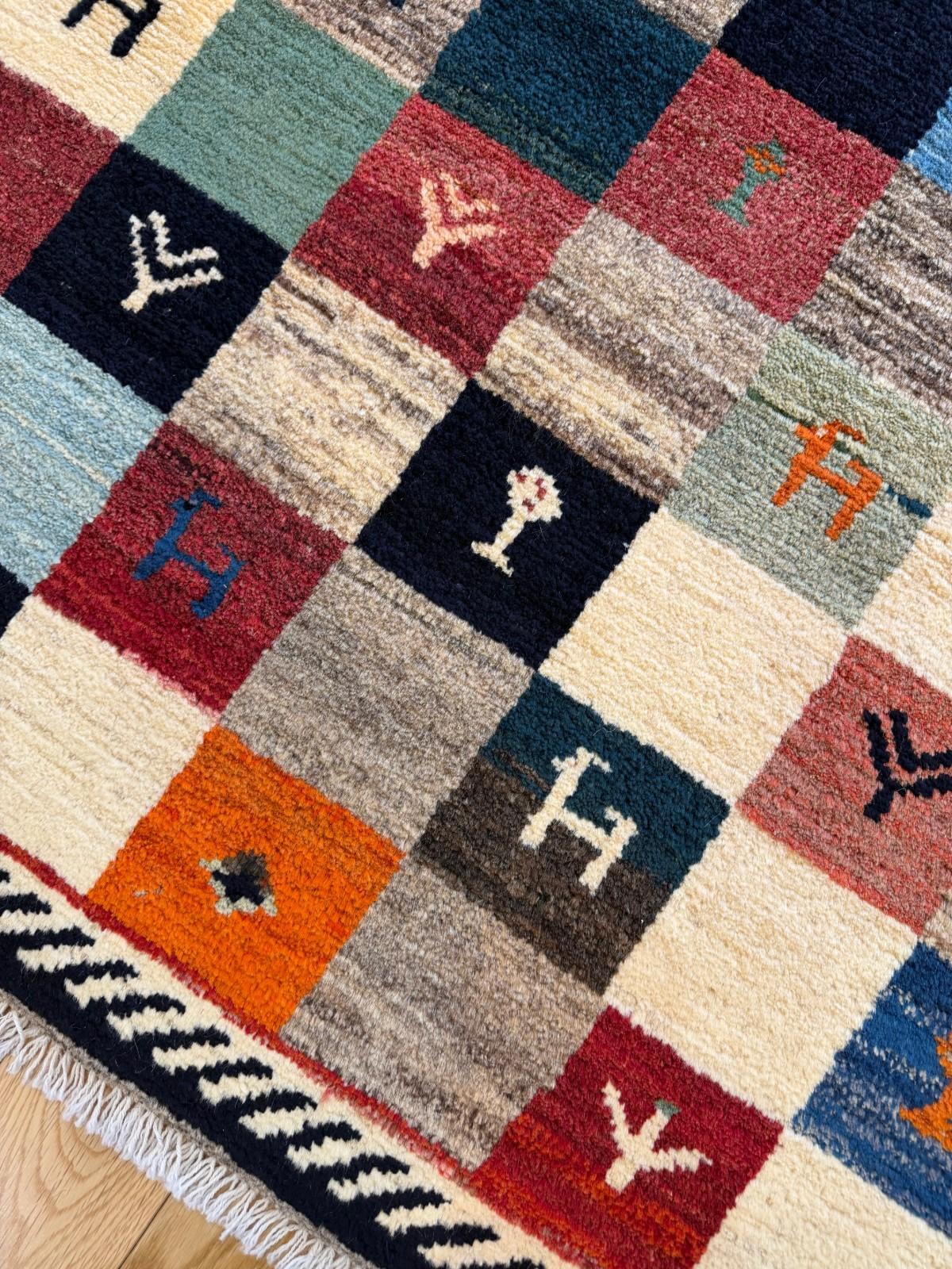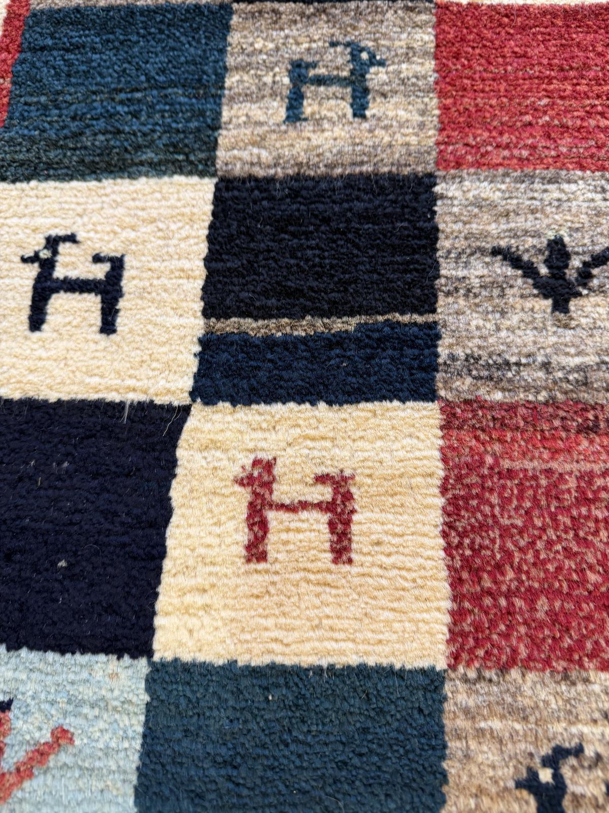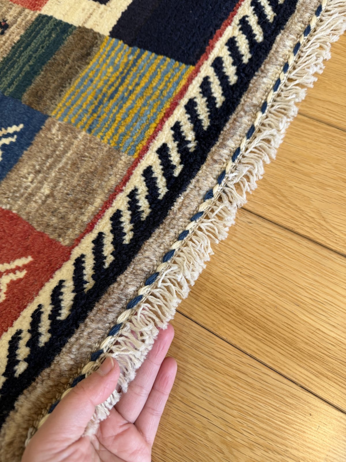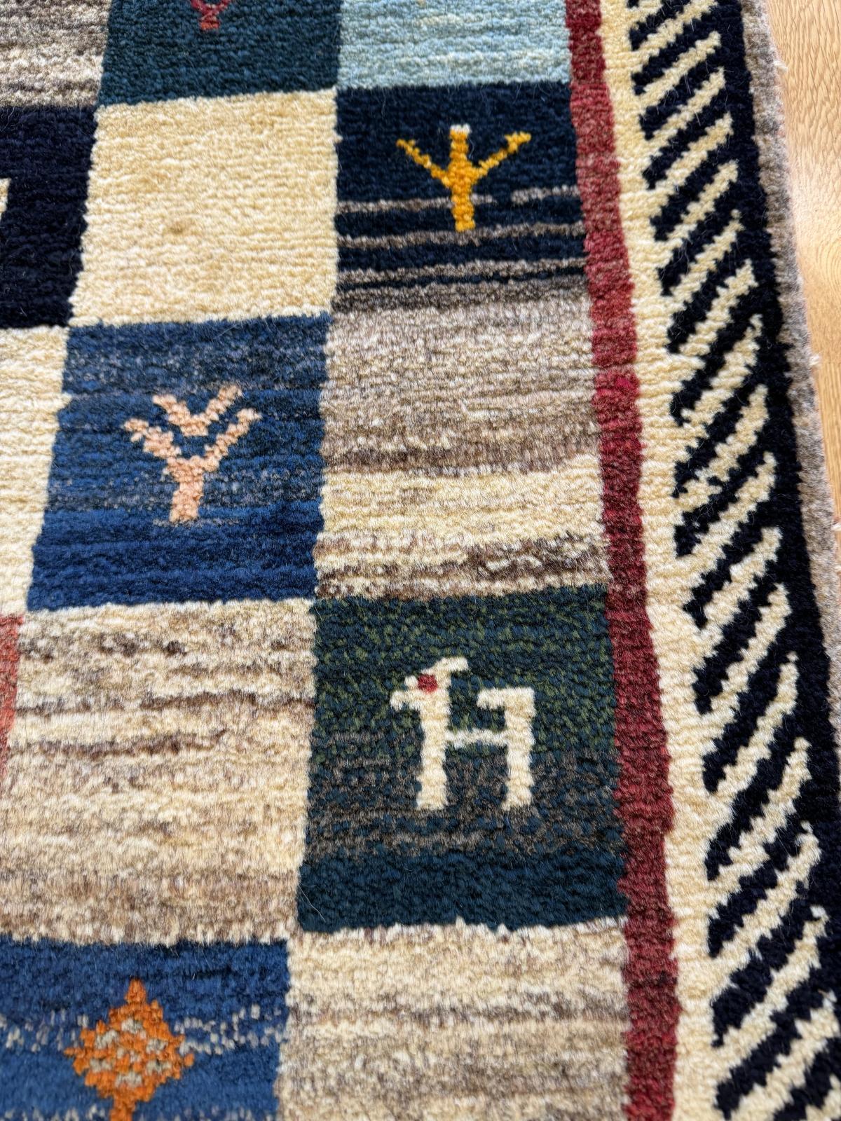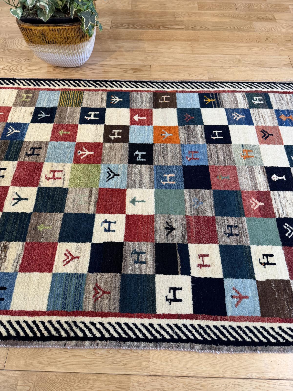 作られてから時間が経っているので新しいギャッベに比べ肌触りが柔らかいのと、時間が経つことで出る深みのある色に特徴があります。