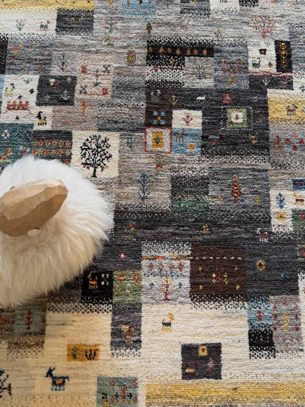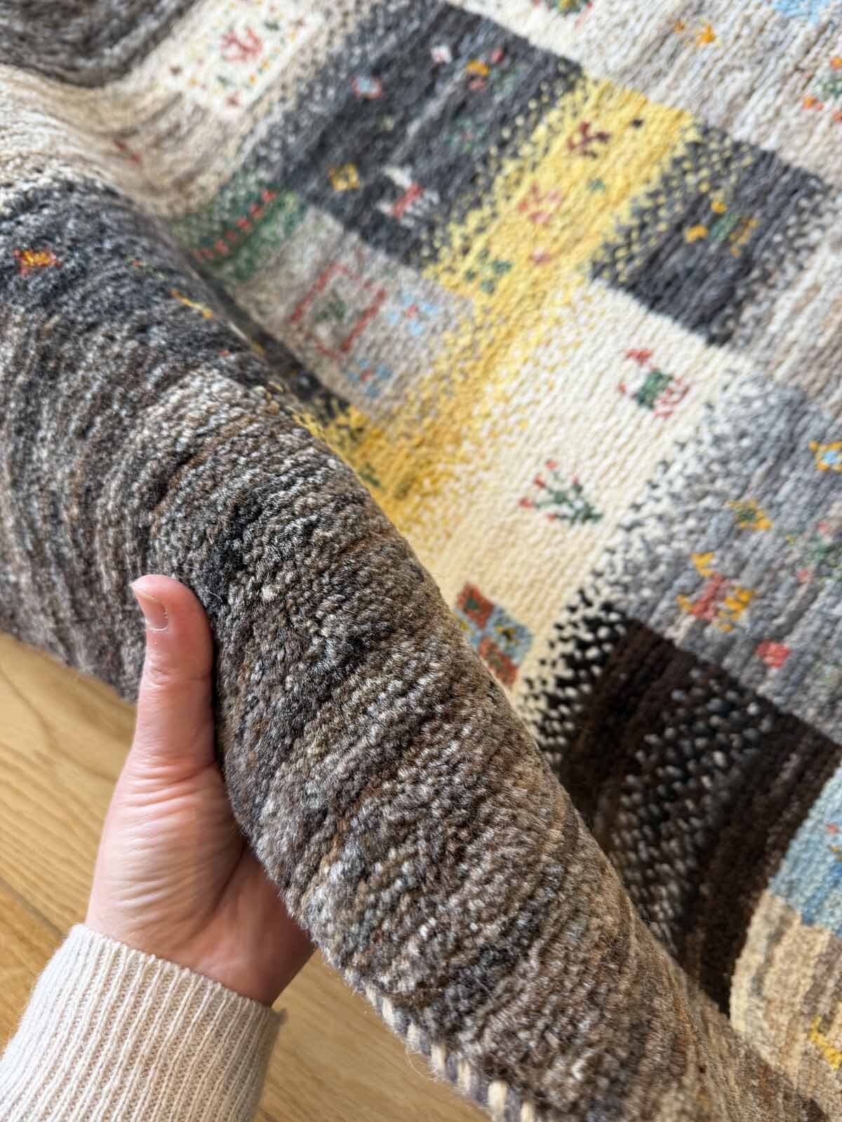 カシュクリは冬を越した羊の毛を使い手紡ぎされたランクの高い糸を使っています。肌触りも柔らかく光沢があるのが特徴です。結びが細かく整った模様が魅力です。毛足は短めでスッキリした印象。