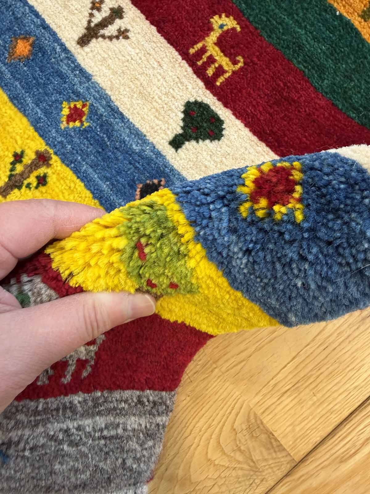 カシュクリは冬を越した羊の毛を使い手紡ぎされたランクの高い糸を使っています。肌触りも柔らかく光沢があるのが特徴です。結びが細かく整った模様が魅力です。毛足は短い目でスッキリした印象。