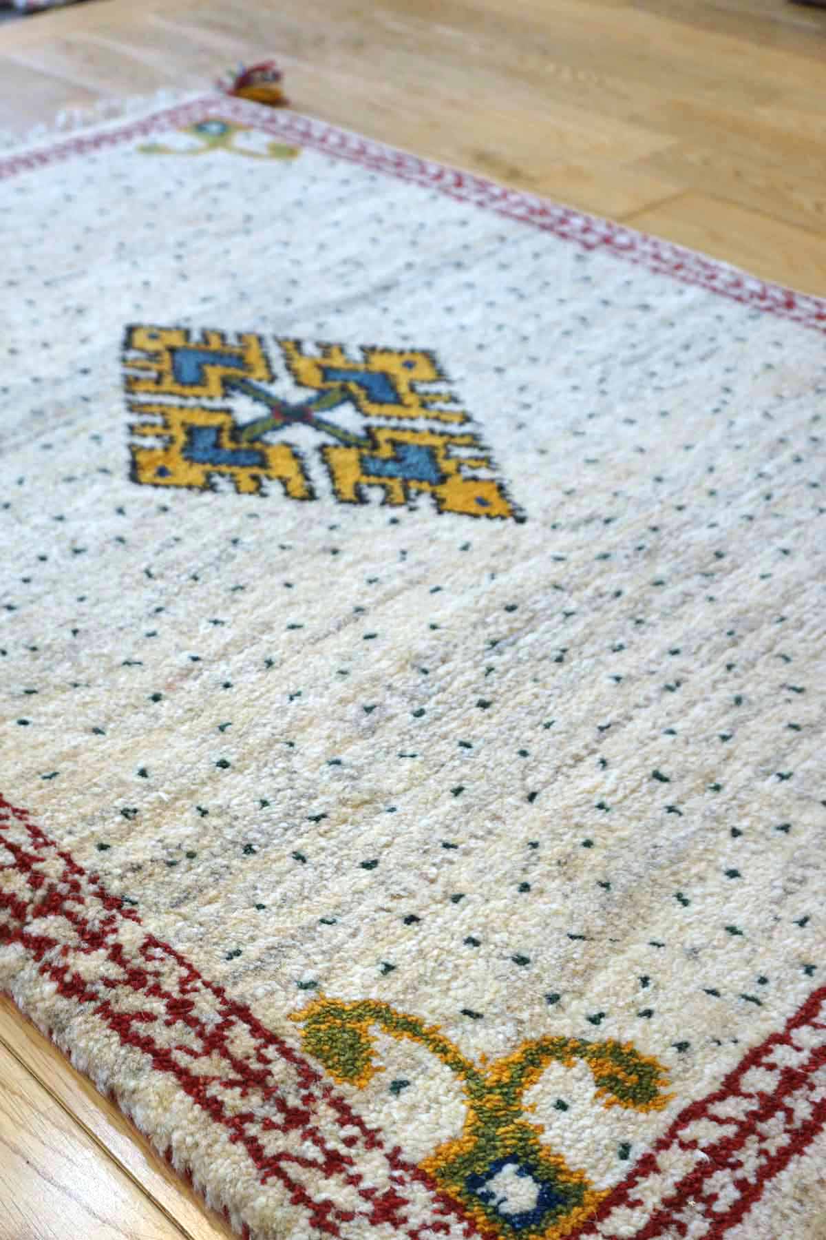 ギャッベは毛足が長くフンワリ感があります。結びが大きいので模様も大きく手作りの温かさがあります。