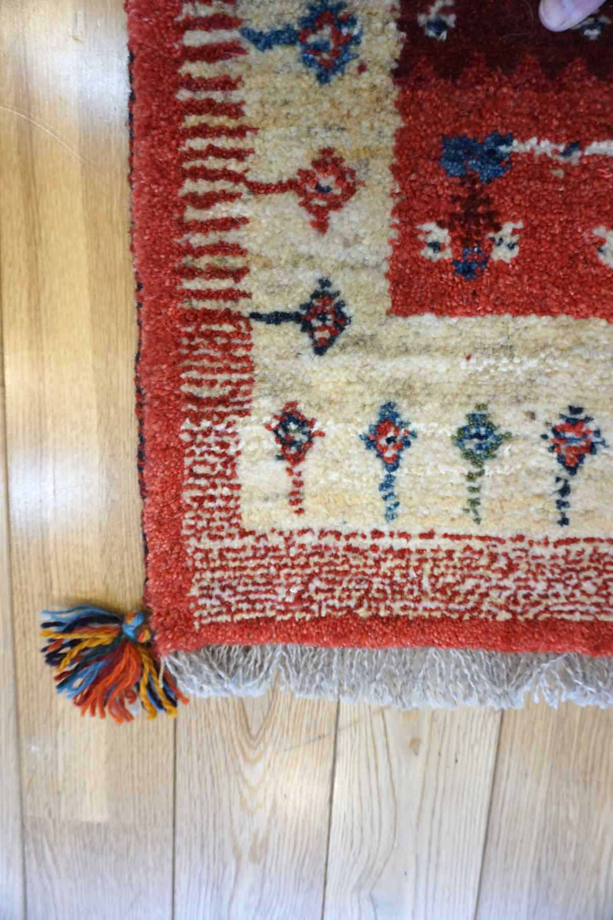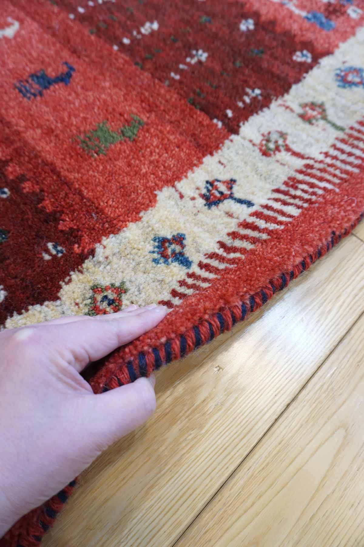 ギャッベは毛足が長くフンワリ感があります。結びが大きいので模様も大きく手作りの温かさがあります。